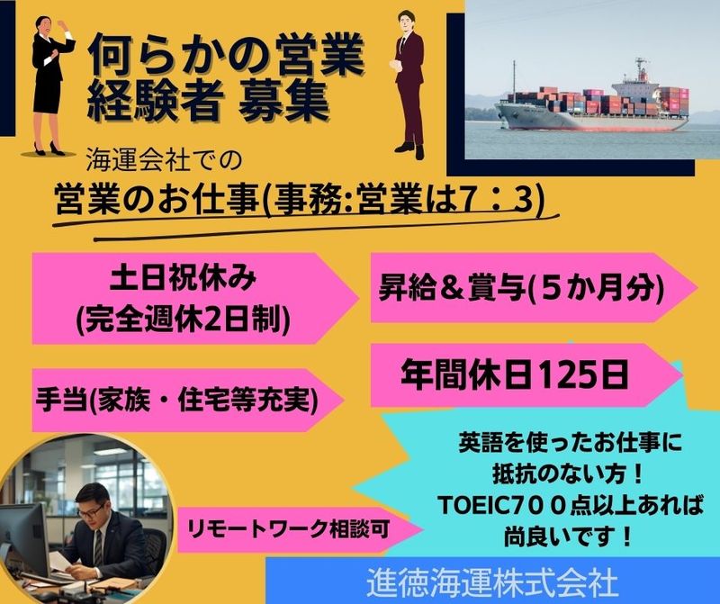 メッセージ ◆◆◆◆◆◆◆◆◆◆◆◆◆◆◆ ◎今までに何らかの営業経験がある方 ◎英語を使って仕事をすることに 抵抗のない方 ◎TOEIC700点以上あれば尚可! ◆◆◆◆◆◆◆◆◆◆◆◆◆◆◆ 『営業』ではありますが、 「営業:事務は3:7」と 事務作業の方が割合が高いです! ◎年間休日125日 ◎完全週休2日制 ◎1日9:00~17:00(休憩60分)の 7時間勤務と、拘束時間が短い! ◆―――――――――――◆ 原材料や工業製品を大量に かつ低コストで運ぶことのできる「船」は 貿易立国である日本の物流の根幹を 担っています そんな船を扱う企業として 皆さんの生活をサポートしているのが 進徳海運株式会社です ◆―――――――――――――◆ ▽▽▽▽▽▽▽ ☆こちらのお仕事は、 企業様からお預かりし 転職エージェント『しごと計画学校』が ご紹介するお仕事です 『しごと計画学校』については 下記「その他欄」に記載しておりますので ご参考ください ★何らかの営業経験がある方★英語を使ってお仕事をすることに抵抗がない方(目安はTOEIC700点以上) 労働者派遣事業(派33-300443) 職業紹介事業(33-ユ-300208)
