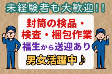 仕事内容 <新着>軽作業スタッフ募集! 無資格・未経験者も歓迎! 封入機械のオペレーター業務及び検品作業 20代~50代の男女活躍中! 【ポイント】 ・無資格、未経験者も歓迎 ・日勤と夜勤の交替勤務でしっかり稼げる ・週払いOK、仮払い制度あり ・冷暖房完備 ・福生からの送迎バスあり ・資格取得制度あり (費用全額会社負担・社内講習あり) ・交通費全額支給(規定有) ・社会保険完備 【詳しい仕事内容】 封筒や紙製品の製造工場での作業です。 冷暖房完備の働きやすい職場! ・封入機機操作・検品・梱包 機械封入後、紙製品の傷・はがれ等がないかの検査をします チェック後に品番を確認し、箱詰めします。 【未経験者大歓迎】 1ヶ月の丁寧な研修があるので未経験者も安心! 「新しく挑戦したい」 「コツコツ・モクモク作業が好き」 「ハローワークで未経験の仕事を検索中」 という方にオススメです。 社員による丁寧なサポートやフォローもあります。 【経験者は優遇&大歓迎】 工場内機械操作・検査・検品・仕分け・ピッキングなどの経験者は大歓迎! アルバイト・パート、派遣スタッフ、正社員など前職の働き方は問いません。 ブランクがある方の仕事復帰もOKです。 【勤務について】 日勤と夜勤の2交替勤務です。 4勤2休のシフト制になります。 日勤4日→2連休→夜勤4日を繰り返すシフトです。 休みもしっかりと取れます。 【勤務地について】 福生市内にある企業でのお仕事です。 当社スタッフも多数活躍中! ・JR八高線の東福生駅より徒歩で5分 ・JR青梅線の福生駅より送迎バスで5分 車(マイカー)・バイク・自転車通勤がOK! 交通費全額支給(規定有)もあります。 お電話またはWEB応募よりご連絡ください。 入社日等も相談に応じます。 気になる点やご不明点等のお問合せも歓迎です。 【電話応募・お問合せ先】 TEL.0120-197-088 TEL.042‐541-9855 (受付/平日9:00~17:00 ※土日祝除く)