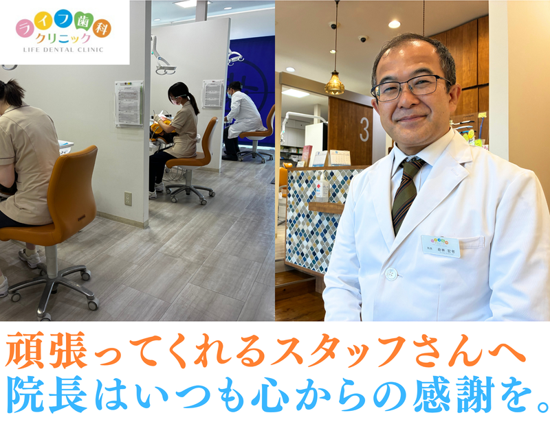仕事内容 ✅歯科衛生士募集✨月給27万円以上✨完全週休2日制✅ 平塚のライフ歯科クリニックの 院長、倉林(くらばやし)です。 当院は神奈川県平塚市の 平塚駅から徒歩10分ほどに位置する 地域密着型の歯科クリニックです。 ■歯科衛生士の仕事内容について■ 予防処置から診療補助まで 一般的な業務をお任せします。 予防処置に関しては 治療の流れが確立されている為、 ブランクのある方や新卒の方においても 安心して勤務が出来る体制が整っています。 長年通ってくださる患者様が多い為、 1人ひとりの治療経過を実感出来る事は ご自身にとっての成長にも繋がります。 また、無理な研修や院内教育はしていません。 愚痴や陰口で誰かを否定する人もいません。 だからこそ、人間関係も抜群に良いと思います。 当院は患者様のプライバシー確保と換気の為に 診療台は半個室の設計となっています。 診療時はゴーグルの装着、 消毒・滅菌も丁寧に行っておりますので、 見学の際にぜひご確認ください。 ✅長く安心して働ける医院✨✅ 働き方改革を常々実施中です! ・診療時間は19時まで&残業はかなり少なめ! ・季節毎に長期休暇取得を目指しています(今年の夏は8日間休みでした✨) ・祝日の振替出勤も年間数える程度で少なめ ・長く安心して働けるように社会保険完備 ✅倉林院長より新しい仲間へメッセージ✅ 私自身がいつも大切にしている事は 「ライフ歯科クリニックで人生をご一緒に歩みませんか」 という想いとなります。 様々なライフイベントを楽しめて、 そして長く働き続けられる 安心のクリニックにする事が目的です。 じつは私自身の子どもが小さかった時、 まさに開院した後でしたので みんながお世話をしながら 一緒に育ててくれました。 あの時は本当に助かりましたし、 何より、人の愛情や優しさを感じて すごく嬉しかった事を今でも思い出します。 だから、 全てのスタッフさんと長いお付き合いをしたい。 少し本音を言うと、 「みんなの人生に次は僕が恩返しをする役目だから。」 これが正直な気持ちです。 当院はまだ8年目を迎えたばかり。 新しい仲間がいる事で みんなで長くご一緒に過ごせるはず。 今回のメッセージにて もしご興味を頂けるようであれば 一度、院内の雰囲気を見に来てみませんか。 ご応募を心よりお持ちしていますね。 ✅ライフ歯科クリニックの情報はこちら✅ ・HPはこちら https://www.life-dc.jp/ ・採用専用サイトはこちら https://arwrk.net/recruit/life-dc