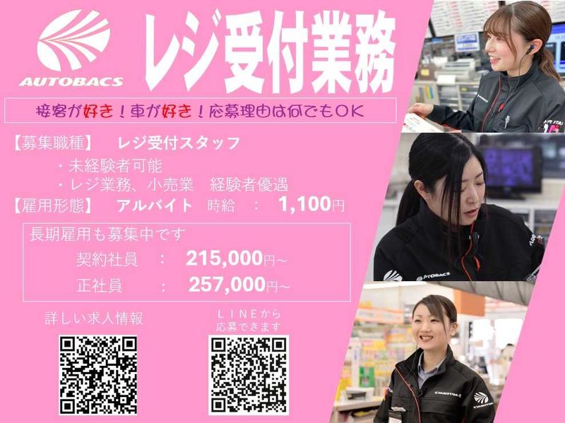 仕事内容 オートバックスでのレジ受付スタッフ/パート・アルバイト/新札幌 未経験OK!クルマが好き!接客が好き!応募理由は何でもOK! 「オ~トバックス♪」のCMでおなじみのオレンジの看板のお店で一緒に働きませんか? >未経験者OK・ブランクがあってもOK! >Wワークも可!あなた次第で正社員への道も! >カー用品をお得に購入できる社員割引有り! 腰を据えて働きたい方にもピッタリの職場です! 楽しく・愉快で元気な仲間と一緒に働きましょう♪ クルマの整備等の難しい業務はございません。 明るい笑顔と元気な挨拶でレジや商品出しの業務をお願い致します。 接客経験がない方でも大丈夫です!分からない事があったら先輩がサポートするので安心して勤務して頂けます。 車の知識が無くてもできる簡単な事をお願いいたします。 ■レジ業務全般 コンビニやスーパーのレジ経験者ならすぐ慣れます! ■オイル交換・タイヤ交換の受付など ※スキルアップにより昇給も可能です。 ※勤務地について オープンまで札幌市内の既存店で研修を実施いたします。 アピールポイント レジ未経験、店内業務は初めて、クルマ用品には詳しくない。 そんな方でも全く問題ありません! 先輩スタッフが優しく丁寧に指導します!ご安心ください! スーパーのレジ打ちならやったことあるけど・・・ そんな方も是非ご応募下さい! あなたの経験をオートバックスで活かしてみませんか? お仕事内容 <レジ業務全般> レジ受付はお店の顔でありお客様に与える印象が一番高い重要なポジションです。 お客様とコミュニケーションをとりながら対応をお願い致します。 <一般的な接客> オートバックスのお店の顔として、接客をお願いします。 クルマに関する知識はなくても大丈夫! クルマのことや作業の基本は、入社後に先輩スタッフが優しく丁寧に指導しますよ! 少しずつ簡単な作業からスタートしましょう。 慣れてきたら… <オイル交換・タイヤ交換の受付など> もちろん無理にお願いはしません! スキルアップにより昇給も可能です。 ___________________________________ 【LINEでの応募はこちらから!】 当社を友達追加をしていただくことで、「応募」となります。 その後トークルームで、どの求人(職種・店舗・雇用形態)をご覧になったかをお送りください。求人についての問い合わせも、LINEをご活用ください!