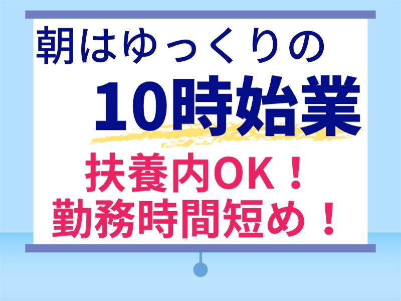 勤務時間詳細 10:00~16:00(実働5時間30分) または 10:00~16:30(実働6時間) *休憩30分 *扶養内OK!