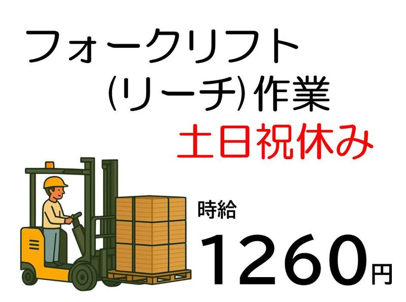 仕事内容 段ボールを扱う物流倉庫で、 フォークリフト(リーチ) を使用した以下の業務をお任せします。 ・パレット積み商品の出庫作業 ・倉庫内での荷かわし・移動作業 ・商品の整理・運搬などの付随業務 ★土日祝休み ★適度な運動になるシンプル作業 ★17時になったらサッと帰ろう♪