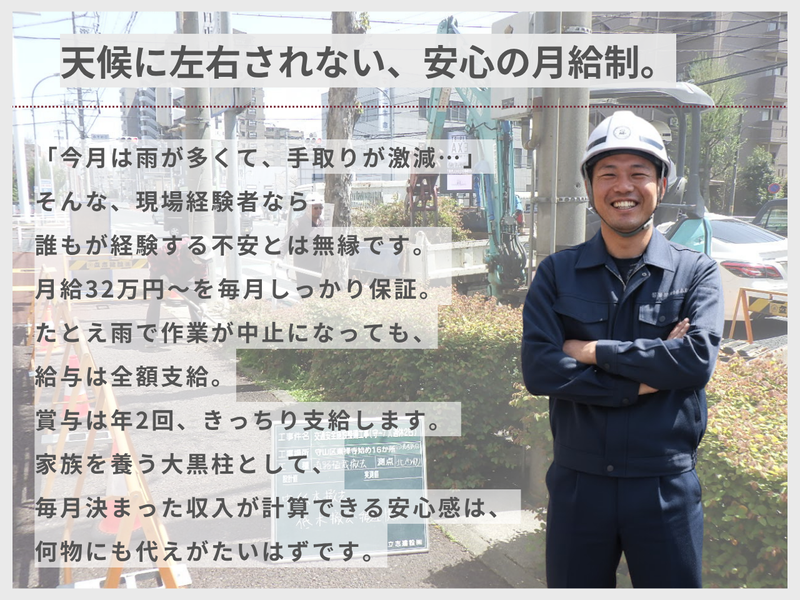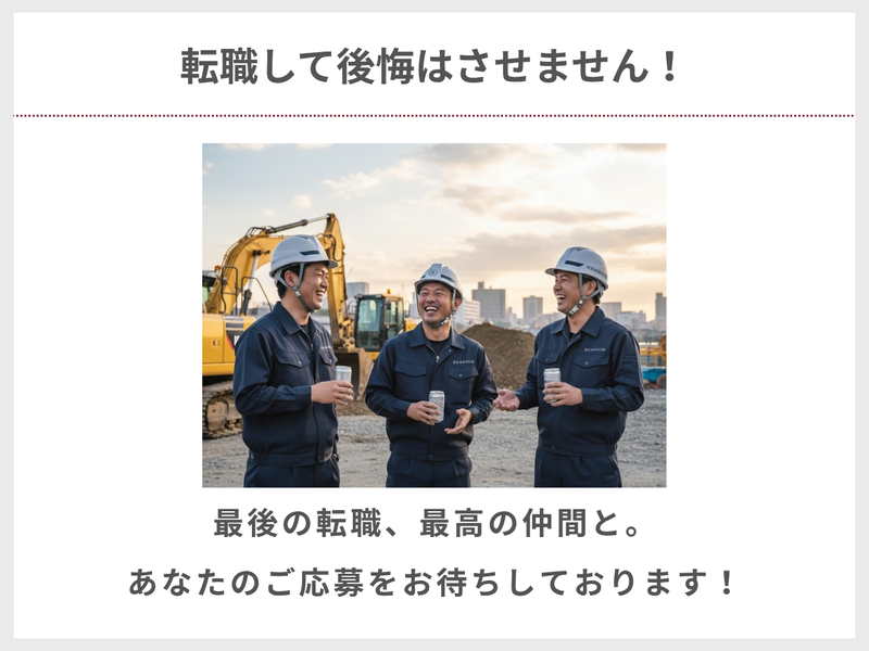仕事内容 \\\ ✨電話応募OK✨ /// 052-737-2313 担当/総務課 ⭐59歳以下全員面接!⭐ セカンドキャリア・女性の転職も応援◎ 当社は公共工事や地域のインフラ整備を手掛けています。 あなたには、土木工事現場での作業全般を担当していただきます。 *‥‥*‥‥*‥‥*‥‥*‥‥*‥‥* ⭐基本土日祝休み(会社カレンダーで土曜出勤あり) ⭐月給34万円~の安定収入×天候に左右されない! ⭐残業少なめ!自分の時間もしっかり確保◎ ⭐有給取得率ほぼ100%!子どもの行事も安心♪ ⭐資格取得も応援!スキルアップ可能 「現場仕事は好きだ。 でも、天候で給与が減るのは、もうこりごり…」 そう思っているあなたへ。 立志建設は、家族を支える“大黒柱”のその覚悟を、 業界トップクラスの「安定」で全力でサポートします。 日給制や日給月給制の不安… 私たちもよく知っています。 だから当社は、 2025年10月より思い切って 【月給34万円~】の完全月給制(固定給)に切り替えました。 雨で現場が休みになっても、給与は1円も減りません。 むしろ、給与はそのままで 「休みが増えた」と喜ぶ社員もいるくらいです(笑) あなたのその経験を、 今度は「安心」のために使ってください。 ■経験者にこそ選んでほしい、 立志建設の「3つの約束」 ┈┈┈┈┈┈┈┈┈┈┈┈┈┈┈┈•• 私たちは、 社員とその家族の生活を守ることを第一に考えています。 【約束1】 収入の不安をゼロに。 天候不問の「完全月給制」  ̄ ̄ ̄ ̄ ̄ ̄ ̄ ̄ ̄ ̄ ̄ ̄ 「今月は雨が多くて、手取りが激減…」 そんな、現場経験者なら誰もが経験する不安とは無縁です。 **月給34万円~**を毎月しっかり保証。 たとえ雨で作業が中止になっても、給与は全額支給。 賞与は年2回、きっちり支給します。 家族を養う大黒柱として、 毎月決まった収入が計算できる安心感は、 何物にも代えがたいはずです。 【約束2】 「ただいま」が毎日言える。 家族との時間を最優先。  ̄ ̄ ̄ ̄ ̄ ̄ ̄ ̄ ̄ ̄ ̄ ̄ 「きつい現場」=「帰れない」ではありません。 当社は「家族との時間」を何より大切にします。 残業少なめ └毎日夕方には「お疲れさん!」と帰るのが当たり前。 家族と囲む晩ごはん、子どもと入るお風呂。 そんな“当たり前の幸せ”を毎日実感できます。 基本土日祝休み └週末は家族サービスに専念できます。 【約束3】 「休みたい」が言いやすい。 有給取得率ほぼ100%!  ̄ ̄ ̄ ̄ ̄ ̄ ̄ ̄ ̄ ̄ ̄ ̄ 「子どもの運動会があって…」 「急に熱を出して…」 そんな時、ためらう必要はありません。 有給取得率ほぼ100%! 社長も先輩も「行っておいで!」と快く送り出します。 GW・夏季・年末年始は各9連休(実績)。 5月と8月は「月の半分が休みだった」なんて年も(笑)。 家族旅行や帰省も、 気兼ねなく計画してくださいね。 ■仕事内容 ┈┈┈┈┈┈┈┈┈┈┈┈┈┈┈┈•• 公共工事や地域のインフラ整備がメインです。 あなたには、土木工事現場での 「手元作業(サポート業務)」を中心にお任せします。 施工補助 └重機オペレーターや先輩の指示のもと、 土を運んだり、 型枠や資材を運搬・設置します。 資材移動・整理 └コンクリートや砂利、パイプなどを 必要な場所へ運びます。 片付け・清掃 └現場の安全と整理整頓を保つ、 大切な仕事です。 ※いきなり難しい作業を任せることはありません。 あなたの経験やスキルに合わせて、 できることからお任せします。 ■採用担当からメッセージ ┈┈┈┈┈┈┈┈┈┈┈┈┈┈┈┈•• 「日給制のままじゃ、家族を安心させられない…」 「雨の予報が出るたびに、ため息が出る…」 もし、そんな悩みを抱えているなら、 一度お話ししませんか? 当社も以前は日給制で、 社員が苦労する姿を見てきました。 だからこそ、 社長が「社員の生活を守る」と覚悟を決め、 月給制へ移行したんです。 あなたの現場経験は、 当社にとって大きな力になります。 今度はあなたが、家族を安心させる番です。 スーツ不要、いつもの服装で構いません。 面接は1回のみ。 まずはお電話だけでも歓迎です。 【電話応募】052-737-2313(担当:総務課) 「求人を見た」とお伝えいただくとスムーズです。 アナタからのご応募を、心よりお待ちしています。