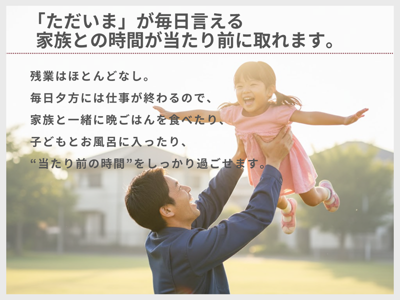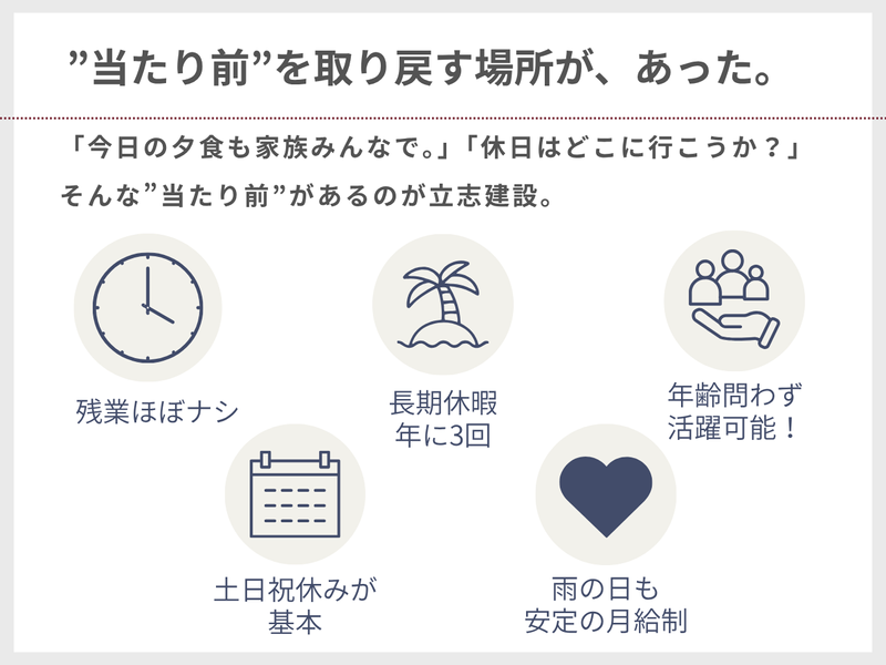 休日休暇 ✅ 年間休日105日+有給休暇5日=実質年休110日以上! ✅ 有給取得率100% ✅ 週休2日制 ✅ 基本的に土日祝休み ✅ 雨の日もお休みになることも! 〈休暇〉 ・GW(12日実績あり) ・夏季休暇(9日実績あり) ・年末年始(10日実績あり) ・年次有給休暇(半年後10日) ・慶弔休暇 ・育休あり ⭐5月&8月は“月の半分がお休み”!? ――――――――――――――――――― 5月のGWは【12連休】、 8月のお盆休みも【9連休】!! それぞれ出勤日数は15日と16日で、 まるで「半月バケーション」♪ この長期休暇には、 「家族と旅行」「趣味の時間」「ゆっくり充電」など、 自分らしい過ごし方ができます。 たっぷりリフレッシュできるからこそ、 オンもオフも全力で楽しめる ――それが立志建設の働き方です✨ ⭐社長の想い ―――――――――― 「社員には家族との時間を大切にしてほしい」 だから、この業界では珍しく、 長期休暇もしっかり取得できます。 さらに、有給取得率100%・育休制度も完備。 制度があるだけでなく、 しっかり活用できるので安心です✨ 趣味や家族の予定も、心置きなく楽しめる環境ですよ◎