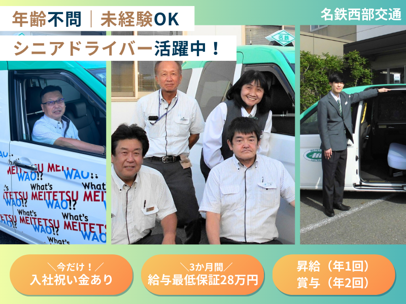 仕事内容 ✨完全未経験からデビューする方多数✨ \なぜ名鉄西部交通が選ばれるのか?/ ✅年収700万以上も可能 ✅今だけ入社祝い金あり ✅選べる勤務体系! ✅未経験から会社負担で 二種免許取得が可能◎ ✅3か月間給与最低保証28万円♪ ✅中途入社の多くが未経験スタート! ✨高収入 × ワークライフバランス、 両方叶えたいアナタへ!✨ 意欲重視の採⽤です︕ 安定企業ならではの安心環境で、 ""しっかり休んで” ""しっかり稼ぐ” を実現しませんか? 業界・職種未経験 or ブランクがあっても大丈夫! 少しでも気になった方は ぜひ応募してみてくださいね(^^) ✨✨✨✨✨✨✨✨✨✨✨✨✨✨ \\働く社員さんの声をご紹介// 【休みが多くてうれしいです♪】 「2勤1休制なので、プライベートの 時間が今までよりも断然長くなりました。 趣味や家族との時間をしっかり確保できる ようになり、家事の分担も増えましたね(笑)」 【身体的負担が少ないです!】 「車庫待ち営業がメインなので、 身体的負担が少なく、 配車指示はカーナビに直接送られるので、 地理が心配な方でも安心です。」 \\この求人のオススメポイント// 選ばれる理由ココにあり! ✅名鉄グループならではの安心感! ✅2種免許取得制度あり! ✅賞与あり(年2回) ✅インセンティブ制度 ✅各種手当 ✅社会保険完備 ======================= ★【名鉄グループならではの魅力✨】 ======================= ✅当グループは病院やホテルなど 様々な施設と契約していて、 タクシーチケットの会員数は 地域トップクラスです! つまり、仕事量が安定しています! ✅名鉄西部交通が待機できる乗り場は たくさんございます! <下記一例> ・名古屋鉄道の主要駅 一宮駅、稲沢駅、国府宮駅、 犬山駅、江南駅、西春駅 など ・商業施設 イオン、アピタ、ドン・キホーテ、ピアゴ など ・ 病院 江南厚生病院、徳洲会病院、 一宮西病院、春日井市民病院 など 他多数 ✨新人保障給有(月額28万円※3ヶ月間 規定あり)✨ ======================= ★【ドライバーデビューまでの流れ】 ======================= ⭐AT限定免許の方も全然OK⭐ <配属前> 【1】自動車学校へGO!費用全額会社負担 提携自動車学校で 第二種免許取得から開始します。 ↓ 教程は約9日間で終了し、 最終日の卒業検定は 自動車学校にて実施します。 ※通学中は1日12,000円を支給します! ↓ 卒業後は免許センターで 第二種免許試験を受験します。 ↓ 合格(次のSTEP へ) -------------------- 【2】教育センターへGO! 第二種免許取得後は、教育センターで タクシー乗務に必要な研修を受講します。 -------------------- 【3】いざ実地訓練へ! 横乗り研修を開始し、先輩と2人で 接客の練習を行います。 ↓ 上長や先輩と会議室で 横乗り研修の振り返り (フォローアップ)を行います。 ↓ 乗務の悩みや不安などが全て解消されたら 準備万端! タクシードライバーデビューとなります! °˖°˖✧°˖✧✧°˖✧°˖✧°˖✧°˖✧°˖✧°˖✧°˖✧°˖✧°˖✧°˖✧ ✅入社祝い金支給✨ ▼今だけ▼ 今回の掲載期間中に ご応募頂いた方にもれなく 入社祝い金【3万円】を支給!! ※支給要件規定有 ◎皆さんが稼げる/稼ぎやすい環境が 整っています! あなたも安心・安定して働ける 名鉄グループの一員になりませんか?"0代/60代の方も活躍中! 車庫待ち営業メイン!身体的負担軽!