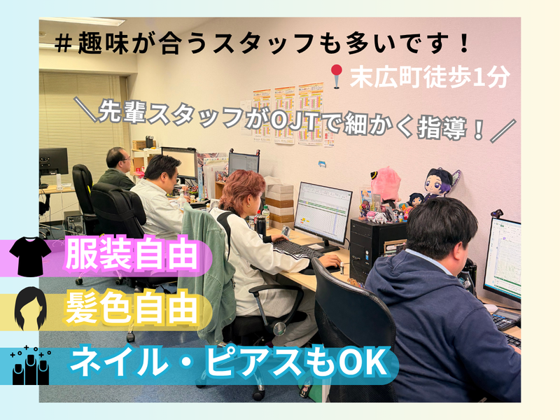 職場環境 30代のメンバーを中心に、ホビー好きが集まる職場です。 「この新作フィギュア、クオリティ高い!」「このアニメ見た?」といった会話が日常的に飛び交います。 対面でもチャットで気軽に相談もできるフラットな雰囲気。 未経験でもしっかり教えてもらえるので安心です。