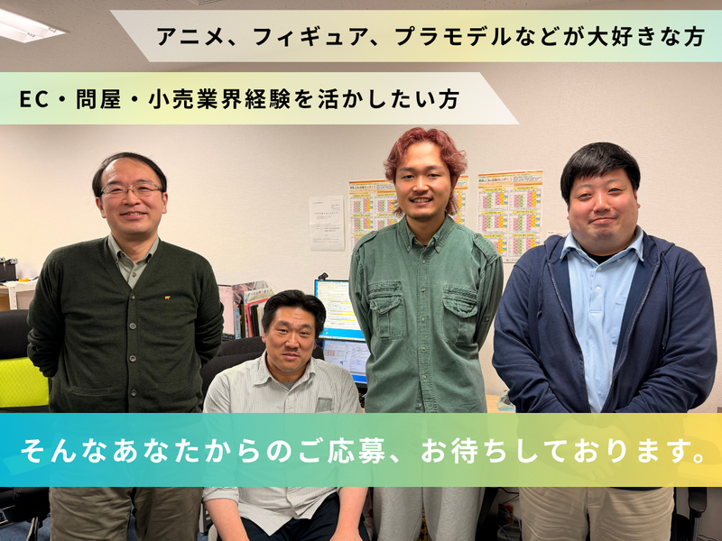 求めている人材 【必須条件】 ・アニメやゲームなどが好きな方 ・Excel基本操作(データ確認、簡単な集計など) 【歓迎条件】 ・EC・問屋・小売業界での実務経験がある方 ・ホビー業界での商品仕入・バイヤー経験がある方 ・SNS(X、ブログなど)での販促プロモーション経験がある方 ・得意なホビージャンルがある方(アニメグッズ、おもちゃ、ぬいぐるみなど特に歓迎) 【こんな方が活躍しています】 ◎ホビーへの熱量がある方 「推し」への愛を語れる ◎トレンドに敏感な方 「今、何が流行っているか」をキャッチできる ◎主体的に動ける方 「こうしたらもっと売れるかも」と提案できる ◎コミュニケーション力のある方 メーカーや社内メンバーと円滑にやりとりできる