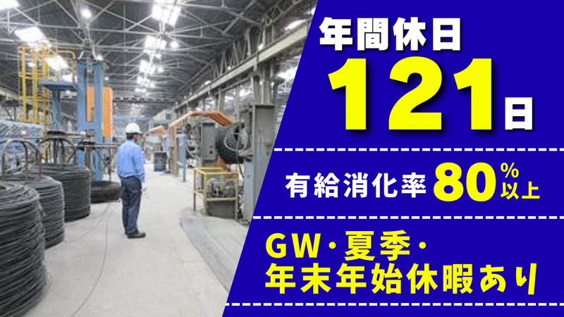 求めている人材 ◆未経験大歓迎 ◆異業種からの転職も歓迎 あなたの生活をこっそり支えてます。 私たちが作り続けているワイヤーロープ。 普段の生活からは見えないですが、実はエレベータや大橋の一部として皆さんの生活を支えてきました。 当社は明治時代からこの事業を続けてなんと130年以上! 今では日本1位のワイヤーロープシェア率を誇る安定企業に成長しました。 この利益をスタッフに還元するため、≪年間休日121日≫と長期連休、年間4ヶ月分の賞与年2回などの 手厚い福利厚生をご用意しています。