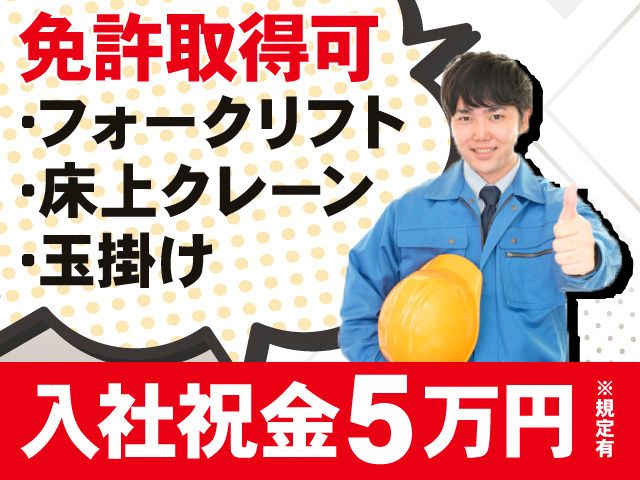 仕事内容 <オススメポイント> ・入社祝い金5万円支給!※規定有 ・入社後にフォークリフト免許など取得可能! ・高時給!時給1,700円 ・月収37.5万円以上可 ・2交替勤務 ・フォークリフト・床上クレーン・玉掛けの資格取得支援制度有※規定有 ・長期休暇あり! <具体的な仕事内容> 電子材料の製造に携わります。 設備や器具を使用して原料の粉砕・梱包などを行います。 重量物の取り扱いもありますが、 クレーン・フォークリフトを使用しますのでご安心ください。 <未経験OK!> フォークリフト・床上クレーン・玉掛けを 運転する為の免許をお持ちでない方も応募OK! 入社後に免許取得が可能です。 この機会にスキルアップを目指しませんか! 既に免許をお持ちの方、 操作経験のある方は即戦力として活躍しませんか? ブランクのある方もお待ちしております <働く環境について> ・20代~50前半の男性活躍中 ・髪色自由 ・ピアスOK ・自動販売機あり ・個人ロッカーあり ・作業着貸与 ・現場へ水筒など持参OK <こんな方にもおすすめ> 高時給で2交替勤務のため、月収37.5万と非常に稼げます。 とにかく稼ぎたい方におススメ! フォークリフト・床上クレーン・玉掛け業務ですが、 それぞれの資格取得のための支援制度があるので、 完全未経験者でも大丈夫!経験不問の稼げるお仕事です!