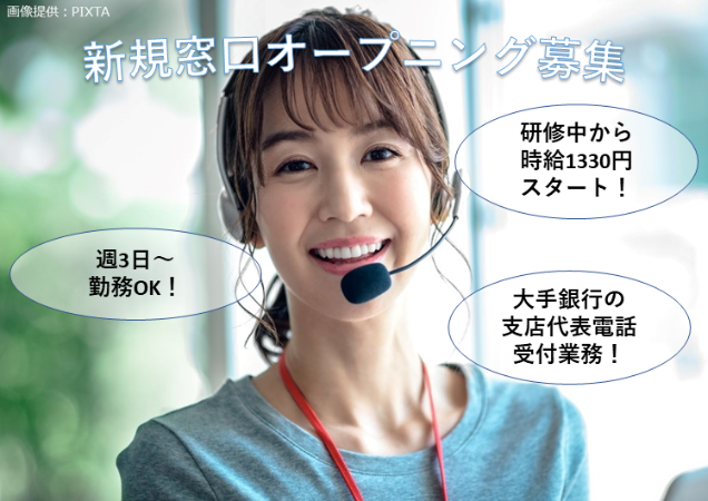 PRコメント 【仕事内容】 みずほ銀行の支店代表電話受付 (支店担当者への取次、担当窓口への誘導、その他コールセンターに付随する業務全般) をお任せします! ★新規オープニングの窓口です★ <<お問い合わせ内容例※想定>> 「口座を開設したい」 「口座を解約したいが、来店できない」 「振込手数料を教えてほしい」 1件にかかる対応時間は5~10分、 後処理は5分程度を想定しています。 °˖✧約60名の同期と一緒に事業所を1から作りましょう!✧˖° 新規窓口のオープニング採用! 全員と同じラインからのスタートで、これから一緒に 事業所を作り上げていただける仲間を募集中です◎ 働きながら、お金に関する知識や、コミュニケーションスキル が身につくお仕事♪ 2026年1月から新しいお仕事、始めてみませんか? <<人気条件が揃ったお仕事!>> ★オープニング ★経験不問 ★研修中から高時給1,330円スタート ★土日祝休み ★17時終業 と、人気条件が揃ったお仕事です! その他会社が定める業務 (業務の必要性に応じ本人の同意を得た場合)