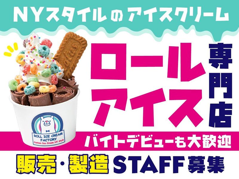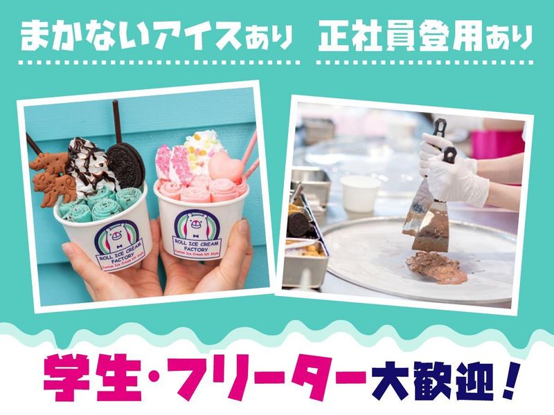 仕事内容 ✨SNSやメディアで話題!✨ おいしくてかわいい ロールアイスの販売&製造 お客様の目の前で、 ヘラでくるくるアイスを巻いて、 かわいくデコレーション♪ お客様のご要望にお応えしながら、 『世界に1つだけ』オリジナルの ロールアイスクリームを作る… そんなワクワクするお仕事です! ―・―・―・―・―・―・―・―・― 最初は何もできなくてOK! 先輩スタッフが一から丁寧に 巻き巻きのコツを伝授します! 主な仕事内容は… ■ロールアイスクリーム調理 ■グッズ販売 ■レジ ■清掃 など ―・―・―・―・―・―・―・―・― 求人のポイント ✅ 週2日 × 1日4h~ 勤務OK! ✅ 授業終わりにそのまま勤務もOK! ✅ アイスは社割でお得に購入可能♪ ✅ 髪型・髪色・ネイルも楽しめる☆ ✅ 学業やサークルと両立できる◎ ―・―・―・―・―・―・―・―・―