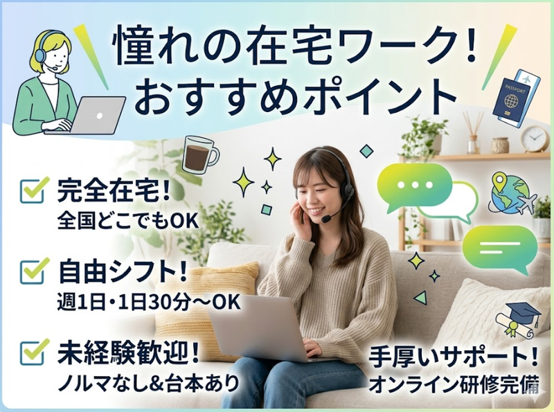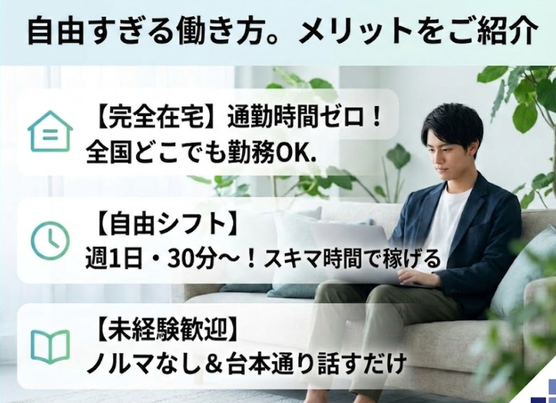 仕事内容 *‥‥*‥ アピールポイント ‥*‥‥* ✨【完全在宅】通勤時間ゼロ!全国どこからでも勤務可能 ✨【自由シフト】週 1 日・1 日 30 分から、好きな時間に働ける ✨【未経験歓迎】ノルマなし&台本通りに話すだけで安心スタート ✨【手厚いサポート】オンライン研修完備で孤独感なく働ける *‥‥*‥‥*‥‥*‥‥*‥‥*‥‥* 【働き方】 家事や育児の合間、副業などスキマ時間を活用できます。 【安心】 専用システムを使用するため電話機不要・通話料ゼロ。就労証明も発行可能です! ⭐ 具体的なお仕事  ̄ ̄V ̄ ̄ ̄ ̄ ̄ ̄ ̄ ̄ ̄ ̄ ̄ ̄ ̄ ̄ ̄ ̄ ̄ ✅ 企業様へのサービスのご案内(発信業務) ✅ご興味を持っていただけた場合のアポイント調整 ✅対応内容の簡単なデータ入力(PC タイピング) ⏩ 業務の流れ ─────────── ▼お好きな時間に PC を起動し、専用システムにログイン ▼マニュアル(台本)を見ながら、リストに沿って発信 ▼企業様とお話しし、サービスをご案内 ▼アポイントが取れたらシステムに入力して完了! ※適宜、オンライン上でサポート担当に質問・相談が可能です。 ⭐教育体制 ─────────── ご契約後、オンラインでのガイダンスを実施します。 専用システムの使い方から、トークスクリプトの読み方、よくある質問への切り返し方ま で、サポート担当が丁寧にレクチャーします。 業務開始後もチャットや通話で随時相談できるため、 在宅でもチームとのつながりを感じながら安心して働けます。 ⭐採用担当からメッセージ ───────────── 「自宅で仕事がしたい」「スキマ時間を有効活用したい」という方にぴったりの環境です。 最初は不安かもしれませんが、充実したサポート体制がありますのでご安心ください。 営業や接客の経験がある方は、そのスキルを存分に活かしてすぐに活躍いただけます!