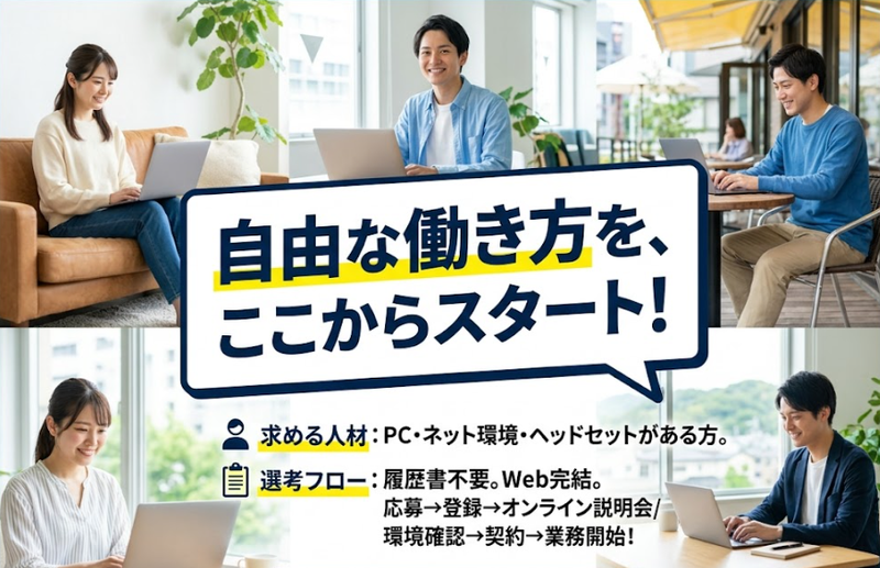 求めている人材 ⭐必須条件 ───────────── ・ご自宅に PC とインターネット環境が整っている方(※スマホ/タブレットは不可) ・マウスとヘッドセットをご準備いただける方 ・業務に集中できる、お一人で静かな環境をご用意いただける方 ・基本的な PC 操作、タイピングができる方 ⭐ 歓迎条件 ───────────── ・数年程度の営業経験(法人・個人問わず)をお持ちの方 ・テレアポ、コールセンターでの発信業務経験をお持ちの方 ・販売、接客など、人と関わる業務の経験をお持ちの方 ・ブランクがある方、主婦(夫)、フリーターの方、W ワーク希望の方 ⭐ 求める人物像 ────────────── ・自律的にスケジュール管理を行い、コツコツと業務に取り組める方 ・オンラインでの円滑なコミュニケーションができる方 ・マニュアルに沿って、明るく丁寧な対応ができる方