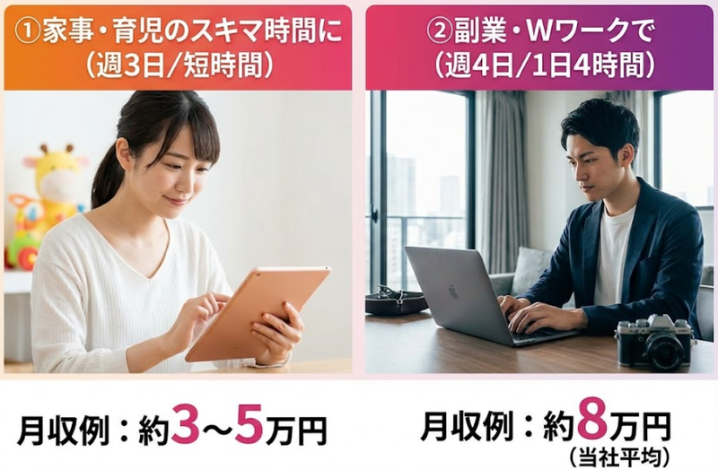 勤務時間詳細 08:00~19:00 の間で、お好きな時間に勤務可能です。 ※週 1 日~、1 日 30 分から OK! ※シフトは毎週希望を提出できます。 <働き方例> ✅家事の合間に:10:00~12:00 ✅お昼のスキマ時間に:12:00~15:00 ✅ガッツリ稼ぐ:9:00~17:00