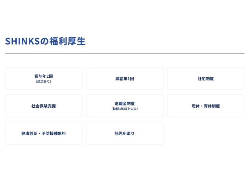 仕事内容 \\自分の可能性を広げていきたい方へ// 株式会社SHINKSでは、事業拡大に伴い、バックオフィスの中核メンバーを募集しています。 単なる事務ではなく、労務・経理など幅広い領域に関わりながら、自分の強みを見つけていけるポジションです。 ★――――*――――★ 求人のアピールポイント ★――――*――――★ ✅ 残業月10h以内で私生活充実 ✅ 完全週休2日制(土日祝休み) ✅ 年間休日120日以上のゆとり ✅ 月給24万円〜35万円+賞与年2回 ✅ 渋谷駅徒歩2分の好アクセス ✅ 20代〜30代の若手が中心に活躍 ✅ 保育・リラクゼーション・建築など多角事業の安定性 ✨具体的なお仕事内容  ̄ ̄ ̄ ̄ ̄ ̄ ̄ ̄ ̄ ̄ ̄ ̄ ̄ ̄ ̄ ̄ ̄ ̄ 事務職全般を幅広くご担当いただきます。 まずはこれまでのご経験を活かせる業務からスタートし、徐々に担当領域を広げていただく想定です。 下記の一部の経験があれば大丈夫です! ✅経理・財務業務 ・仕訳、記帳業務 ・日次・月次決算業務 ・年次決算・税務対応 ・全事業資金管理 ・資金調達全般(銀行) ✅労務・給与管理: ・勤怠データの集計 ・給与計算ソフトへの入力・確認 ・残業時間・有給休暇の管理 ・賞与計算 ✅社会保険・労働保険手続き ・入社・退社時の加入・喪失手続き ・算定基礎届、労働保険年度更新 ・産休・育休手続き、給付金申請サポート ✅社宅・各種保険管理 ・社宅の契約/更新/解約対応 ・火災保険・傷害保険・賠償保険の加入/更新手続き ✅助成金・補助金関連 ・申請作業や実績報告・助成金・補助金の申請業務 ・実績報告対応 ✅各種保険手続き ・火災保険 / 傷害保険 / 賠償保険の加入、更新、受付の手続き ✅その他庶務 ・本社オフィスの環境整備 ・電話対応、来客対応、郵便物管理 ・社内規程(就業規則など)の改定サポート ✨入社後のキャリアパス  ̄ ̄ ̄ ̄ ̄ ̄ ̄ ̄ ̄ ̄ ̄ ̄ ̄ ̄ ̄ ̄ ̄ ̄ 入社後は、これまでのご経験や適性に合わせた業務からスタートしていただきます。 経理・労務・総務など、事務職のさまざまな領域に関わる中で、 ご自身の適性や興味に合った分野で力を発揮していただきます。 管理部門全体への理解を深めながら、得意分野を活かして活躍できる環境です。 日々の実務を通して専門知識を身につけながら、 「幅広く対応できる力」も同時に養っていける環境です。 将来的には、業務改善の提案や仕組みづくり、 制度設計などにも関わり、管理部門の中核メンバーとして活躍することを期待しています。 ✨当社について  ̄ ̄ ̄ ̄ ̄ ̄ ̄ ̄ ̄ ̄ ̄ ̄ ̄ ̄ ̄ ̄ ̄ ̄ 東京・神奈川を中心に27の保育施設を展開するほか、リラクゼーション事業や飲食事業など、多角的に成長を続ける企業 ✨成長の軌跡  ̄ ̄ ̄ ̄ ̄ ̄ ̄ ̄ ̄ ̄ ̄ ̄ ̄ ̄ ̄ ̄ ̄ ̄ 2011年に飲食事業からスタートし、2017年の保育事業開始以来、M&Aを継続的に行い事業基盤を確立。 さらに2025年には、1月に建築事業、5月にリラクゼーション事業を立ち上げるなど、 その成長スピードは現在も加速し続けています。そんな私たちは、次なる事業フェーズに向け、さらなる拡大を予定しています。 ✨こんな仲間が待っています  ̄ ̄ ̄ ̄ ̄ ̄ ̄ ̄ ̄ ̄ ̄ ̄ ̄ ̄ ̄ ̄ ̄ ̄ 20代〜30代が中心となり、 部署の垣根を越えて誰もが助け合う、温かい職場です!