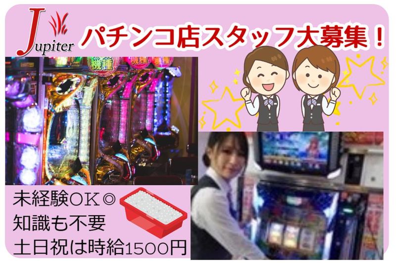 仕事内容 ◇◆◇◆◇◆◇◆◇◆◇◆◇◆◇◆◇◆◇ 超高時給で効率よく稼ぎたい方必見! ▶土日祝は時給1500円~1875円! 未経験から正社員を目指すことも可能♪ 実際にアルバイトとしてスタートし 今やエリア長を務める女性社員も在籍中! 髪色自由&ネイルOKなのも魅力なポイントです♪ ◇◆◇◆◇◆◇◆◇◆◇◆◇◆◇◆◇◆◇ パチンコ店でのホールスタッフをお任せ♪ ◆台のおそうじ ◆灰皿の交換(電子タバコのみ) ◆お困り事がないか、お客様の見回り …など♪カンタンな事ばかり◎な・の・に 高時給でたっぷり稼げちゃうんです☆ ――――――――――――――――――― 【当店ならではのポイント!】 ★パチンコの玉やスロットのメダルを 自動で数えてくれる「各台計数機」導入! 重~い「玉・メダル運び」はありません◎ ★リニューアルしたばかりのキレイな店♪ 最新の空間除去システムや セルフカウンターも導入済み◎ 快適な環境でおシゴトできますよ! ★社員登用あり! アルバイトから社員/エリア長になった 女性Aさんはバイト時代の経験をもとに 働きやすい環境づくりを真摯に考えて くれています◎細やかな気配りや教育制度 にも力をいれており、パチンコ店に入った ことすらない…という新人さんでもスグに なじめて活躍してくれていますよ♪ ★パチンコ好きなスタッフも多数在籍! 「あの新台もう打った?」などの会話も 弾む♪楽しい職場です!もちろん全く興味 ない…という方でも活躍できるのでご安心 くださいね! ★少なめの日数で効率よく稼ぎたい! そんな主婦さんや、夢を追っているので その資金をガッツリGETしたい…という フリーターさんが活躍しています◎ 難しいことはなく、もちろん資格や 経験は不要なのにとにかく稼げます! お金が必要!という方、ぜひご応募を☆ ―――――――――――――――――――