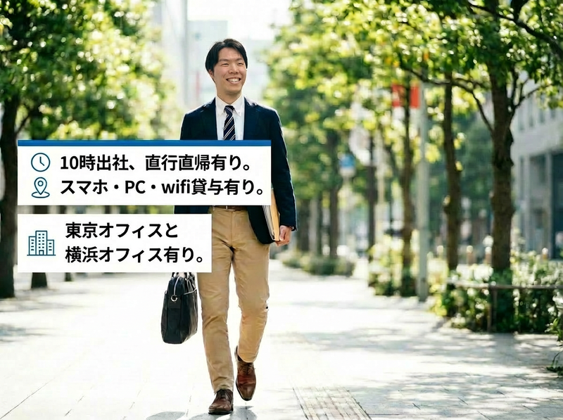 勤務時間詳細 実働時間:1日あたり8時間 平均勤務日数:1ヶ月あたり18日 〜 20日 10:00~19:00(休憩1時間) ※案件により9:00~18:00の 日もあり(営業裁量) ================== 【ダラダラ残業はしません!】 ⏩集中して業務を行っています。 訪問先からの直帰も多く、業務見合い にはなりますが、ほぼ残業はなし! グループ全社を挙げて残業削減に 取り組んでいます。 【NO外出&NO残業dayあり!】 ⏩外出のない日を、週に1日は設ける ようにしています。その日は事務業務 やスケジュール調整に集中。NO残業 dayでもあり、効率よく業務を進める ことができています!