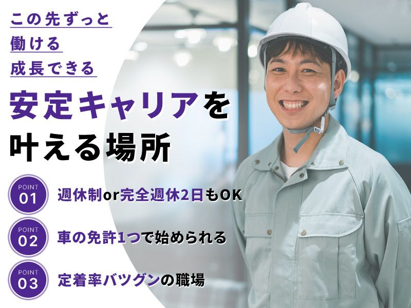 必要資格・経験 【必須】 ・高卒以上 ・普通自動車運転免許(AT限定可) → 実務未経験者歓迎!ブランクOK ※18歳未満の方は22時までの勤務となります。 【歓迎】 ・第一種電気工事士 ・第二種電気工事士 【こんな方なら活躍できる!】 ・身体を動かすのが好きな方 ・元気よく挨拶ができる方 ・チームワークが得意な方 ・向上心をもって仕事に取り組める方 【Check Point】 ・20~30代活躍中 ・経験者歓迎 ・有資格者歓迎 ・子育てママ・パパ在籍中 ・中途社員の比率が高い職場 ・女性管理職登用実績あり