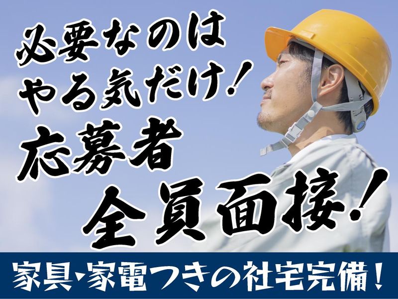 【保険制度】 雇用保険、労災保険、健康保険、厚生年金 待遇・福利厚生 【福利厚生】 ◆昇格あり ◆賞与あり(年1回) ◆有給休暇(法定通り) ◆交通費支給(上限:1万円) ◆週払いOK ◆日払い(応相談) ◆宿要相談 ◆バイク通勤応相談 ◆自転車通勤応相談 ◆退職金制度あり ◆髪型・髪色自由 ◆弁当あり(給料引き) ◆作業着、安全靴、手袋すべて無料支給