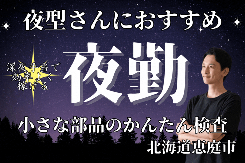 仕事内容 ●20・30代活躍中、男女活躍中 ●未経験・初心者活躍中 ●長期休暇あり、夜勤のみ、土日祝休み ●正社員登用あり ●マイカー通勤OK 【 仕事内容 】 半導体デバイスの製造をお願いします。 扱うのは、LEDに使われる部品の製造です。 お願いするお仕事は下記の2つです。 <マシンオペレーター> 半導体の製造マシンに部品をセットし、 ボタンを操作して加工します。 加工はマシンが行うので、 完成品の部品を取り出して 移す作業などをお願いします。 <顕微鏡検査> 顕微鏡とピンセットを使用して 半導体部品をチェックします。 キズや汚れの有無などを確認して 合格と不合格に分けて作業完了です。 《 重量物ナシ! 》 扱うのは小さな部品で、 1~2センチほどです。 いわゆる軽作業なので、 工場やモノづくり未経験の方でも 始めやすい職場です。 《 クリーンルーム内でのお仕事 》 温度・湿度が管理されているので 季節や天気に左右されずに 快適にモクモクと作業が進められます! 座り作業もあるので身体への 負担も少なくお仕事ができます。 《 夜勤専属! 》 夜型だけど交替勤務は避けたい方へ! 時間が安定!夜勤専属! 時間が安定しているから 生活リズムも崩れることなく お仕事することが可能です♪ 《 モノづくりを支えられる 》 半導体は現在の私たちの生活に 必要不可欠なものです。 取り扱った製品はATMの内部など 日常で関わることの多い製品に たくさん使用されています! そういった製品に関わることができる お仕事です! そのような工場で働くことで 情報社会にて必要不可欠な製品の モノづくりを支えてみませんか? 《 工場周辺には癒し空間あり◎ 》 工場の周辺に 温泉施設があります! 仕事後にサウナでととのうのも良し! ゆっくり入浴して癒されるのも良し! 疲れた身体を休められます☆ 車で5分以内の範囲には コンビニもあります☆ 工場は恵庭市と千歳市の境目にあるので どちらからも通勤ができます◎ 北広島市から通勤している スタッフもいます。