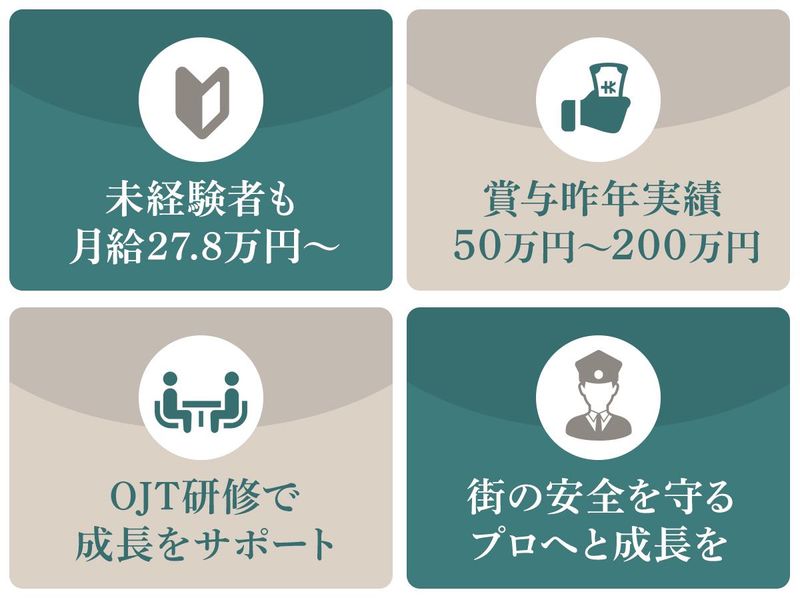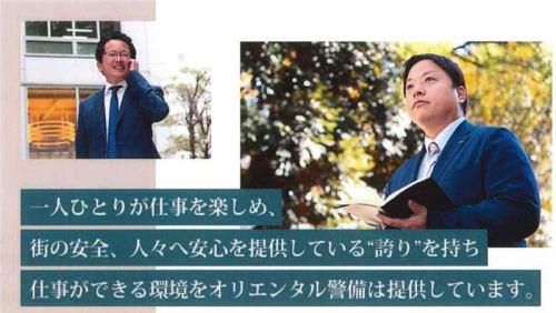 求めている人材 <高卒以上/営業経験・警備業界経験不問> ◎人物重視の採用 ◎人の喜びを実現できる仕事がしたい方 【具体的には】 業界・職種未経験の方歓迎 ・人のためになる仕事がしたい方 ・人間関係を大事にできる方 ・社内外問わずコミュニケーションが取れる方 ・チームワークを大事にできる方 ・向上心を持ち自己成長に向き合える方 ◎社内マニュアル・研修制度が充実しているため、特別なスキル・経験・資格は必要ありません。 入社後に警備事業の専門性は学んでいただけます。 【社員インタビュー】 <取締役営業推進部部長> ◆人を大事にするオリエンタル警備 オリエンタル警備は、人財を大事にしてサービスを提供する会社です。 得た利益は社員教育に投資するなど警備員の質にもこだわっています。 だからこそ自信を持ってお客様に提案ができます。 人財=サービス力。 営業として強いサービス力を発揮できるのは大きなアドバンテージです。 <総務部部長> ◆将来を担う熱い人材を募集! 当社の考えで、「仕事で怒られることは仕方がない、仕事以外で怒られることはしてはいけない」とあります。 仕事のミスは仕方ありません。 挨拶、マナー、約束を守ることなど、社会人として当たり前の礼儀・礼節にはこだわります。 <営業マネージャー> ◆支社間の繋がりが強い 大規模な案件で自分の支社だけでは警備員が手配できない…という場合でも連携してお客様に警備の提案ができるのがオリエンタル警備の総合力です。 支社間で繋がりが強く、ときには連携してお客様にサービスを提供します。 営業は一人ではありません。仲間と共にお客様満足を目指しています。