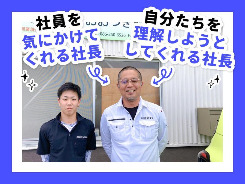 求めている人材 【資格・経験不問◎】◆未経験大歓迎! *普通自動車免許(AT限定可)をお持ちの方/必須 *経験者は優遇 *第一種・第二種電気工事士免許取得者は 優遇 ▼こんな人にピッタリ◎ ――――――――――― *未経験から手に職つけたい方 *ライフステージに合わせた働き方がしたい方 *細かい作業が得意な方 ★将来独立したい方も歓迎! いろんな現場があり、その都度いろんな 仕事を覚えられるので成長速度も速く、 スキルを磨きたい方にもおススメ◎ 【齊藤さん(20歳/2年目/1枚目写真左)】 ― 入社のきっかけは? 面接のときから社長が すごく話しやすくて、 「この人なら未経験の自分でも ちゃんと教えてくれそう」 って思ったのが決め手です。 ― 入ってみてどう? 入社前のイメージ通り、社長は 「従業員が働きやすい会社にしたい」 「みんなの意見をちゃんと聞きたい」って 思ってくれてるのが伝わります。 ― 休みとか働きやすさは? 以前は土曜休みが月1回だったんですけど、 今は隔週休みに。 「この日休みたいな」って相談すれば、 柔軟に対応してもらえます。 実は5月に入籍して、 もうすぐ家族も増える予定なんですが、 そういうライフスタイルの変化も 応援してくれるんです。 ― 社内の雰囲気は? 少人数だから社長との距離も近くて、 何でも相談できるのが安心です。 ― 経験ゼロでも大丈夫? 工具の名前とか使い方から 丁寧に教えてもらいました。 最初の半年は先輩と 一緒に作業しながら覚えて、 だいたい1年半くらいで 仕事の流れが分かるようになりました。 資格取得も全額会社負担で 挑戦させてもらえます。 ― これからの目標は? まだまだ未熟ですが、 どんどん技術を身につけて、 いつか社長に負けないくらいの 技術者になりたいです!