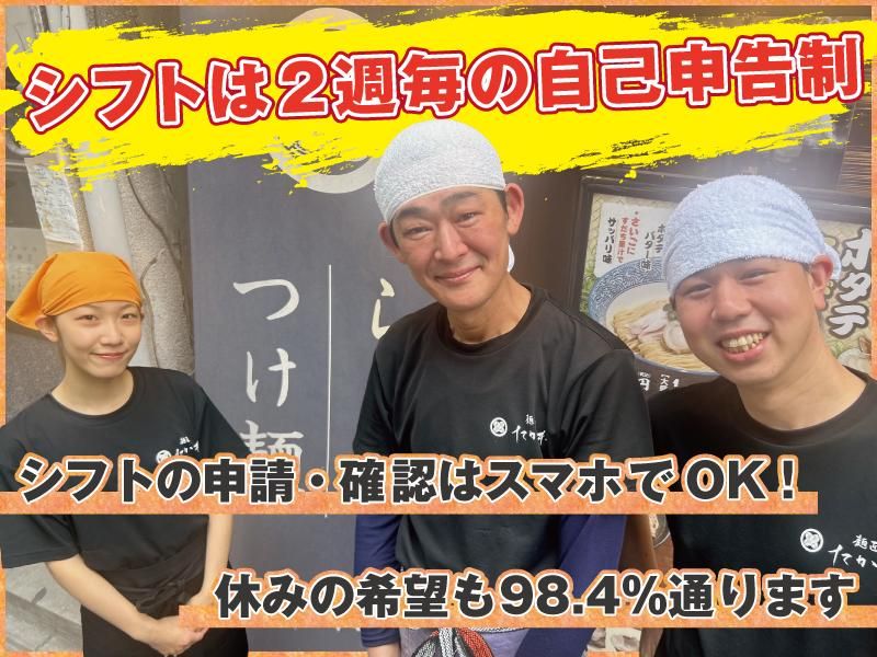 職場環境 常時6~8名でお店を運営しており、フリーターさんも多く在籍! ラーメンが好き!というよりも ・駅から近い ・時給が高い ・働き方に融通が効く と志望してきたスタッフがほとんどです! 喫煙所:喫煙所あり(屋内) 屋内喫煙所あり