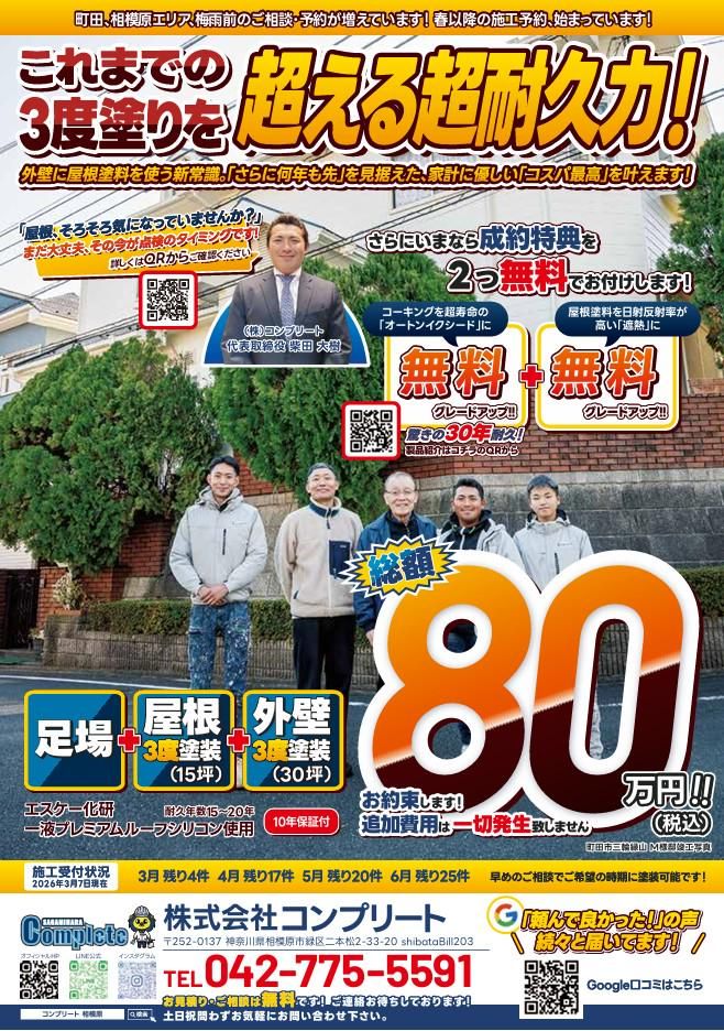 仕事内容 \経験・スキルを活かして働く!/ \HP更新やチラシ作成スタッフ/ ****************** #週3日~OK、週4日入れる方歓迎 #1日6時間勤務できる方歓迎 #時間曜日応相談 #経験者は高時給1450円~! #ブランクOK! #主婦活躍中!扶養内勤務OK! ****************** 株式会社completeは、相模原の街に 密着した総合リフォーム会社です。 安さ・品質にこだわり、 アフターフォローも欠かさない、 そんな姿勢が沢山のお客様に選ばれ おかげ様で現在半年先まで依頼が 埋まっている状態です。 お客様はポスティングチラシや HPを見てお問い合わせいただいた 個人の方です。月に10~11現場 動いています! 今回は制作スタッフとして ・集客チラシの作成・編集 (写真2枚目のようなチラシ) ・すでに公開されているHPの更新 (https://complete-sagamihara.com/) などをおこなってくれる方を募集! 空き時間で事務業務もお任せします。 今は外部のデザイナーさんにお願いしている ので、社内に知識を持っている人がいません。 貴方の経験・スキルを発揮していただき、 より集客力を強化していきたいと 思っています。 ゆくゆくは、SNS集客を強化したり HPをイチから作成してもらったり 幅広く活躍してもらえると嬉しいです。