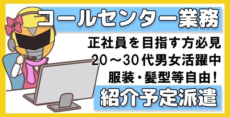 仕事の内容 【⭐正社員目指す方必見🌟コールセンタースタッフ募集⭐】 📢 未経験からでも安心!研修&サポート充実◎ 💡 「話すのが好き」「人と接する仕事がしたい」そんなあなたにピッタリ! インターネット回線に興味のあるお客様へのアプローチをするお仕事です。 現在、20代~30代の男女10名が活躍中!新卒・異業種からの転職者も多数✨ 🔰未経験でも安心!充実の研修&サポート体制🔰 ほとんどのスタッフが未経験スタート! ですが、しっかり学べる環境があるのでご安心ください👍 🔷 入社後の流れ 1 座学研修(基礎知識をしっかり学ぶ!) 2 動画視聴(実際の業務イメージをつかもう!) 3 ロールプレイング(先輩と一緒に練習!) 4 テレアポ実践(先輩がモニタリング&フォローするので安心♪) 5 独り立ち!(でも、わからないことはすぐ相談OK!) 👂 「話し方のコツ」や「言葉遣い」など、自然とスキルアップ! 💻 PC操作やタイピングスキルも磨ける! 💎紹介予定派遣求人💎 3~6ヶ月の派遣期間を経て正社員登用となる『紹介予定派遣』求人! 3~6ヶ月の派遣期間中に就業先の会社の雰囲気や仕事内容をしっかり経験して判断 できますのでオススメの求人です☺ 🌟このお仕事の魅力ポイント🌟 👕 オシャレ自由!あなたらしく働ける♪ 髪型・髪色自由! 金髪・ハイトーンもOK! ネイル・ピアス・ヒゲOK! ファッションを楽しめる職場♪ 服装自由!(制服なし) 私服勤務OKだからリラックスして働ける! ✅ 働きやすい環境&好待遇 残業ほぼなし!(平均1日1時間以内&残業できない方も相談OK) 休憩室&食堂完備! お昼休みも快適✨ 冷暖房完備! 季節を問わず快適にお仕事♪ 無料駐車場あり! 車通勤もラクラク🚗 受動喫煙対策あり(屋内禁煙) ✅ まずは職場見学だけでもOK! 「どんな雰囲気なのか見てみたい…」という方! ぜひ一度、職場の雰囲気を体験しに来てください♪ ✅ 応募資格&こんな方にオススメ! 🔷 未経験OK! 経験・資格・学歴問いません! 🔷人と話すのが好きな方 🔷コールセンターやテレアポ経験者! 🔷 「しっかり研修がある環境で安心して働きたい!」という方 興味を持ってくださった方は、まずはお気軽にご応募ください! 【正社員登用時の労働条件】 月給:232,000円~300,000円(能力により決定) 固定残業代:50,000円/月(40時間) 固定残業代については残業が無い場合も支給となります。 加えて超過する場合は別途支給になります。 賞与:あり(年1回) 昇給:あり(年2回)/評価制度に準ずる 通勤手当:実費至急(上限なし) 各種保険等:雇用、労災、健康、厚生 退職金:なし 定年制:なし 福利厚生:・バースデー手当 →誕生月に特別手当として10,000円を支給 ・テーマパークチケットプレゼント →年に1回、1day2名分の某有名テーマパーク(千葉・大阪等)の チケットをプレゼント ・勤続年数表彰 →勤続3年、5年、10年を迎えた月に年数×10,000円を支給 ・エフ休暇(女性特有休暇) 等 ★本求人にご興味をお持ちの方は、応募する!より必須項目記載の上、 お問合せ下さい。 (お電話でのお問合わせ先:0120-67-3244 ※平日9時00分~18時00分)