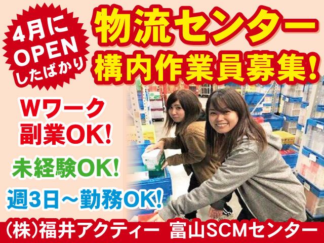 仕事内容 \4月にオープンしたばかりの新センター/ まだまだオープニングスタッフ募集中! 14時~18時は「特別手当」で時給UP! 構内作業(仕分け)スタッフを増員募集します! 同期の仲間がたくさんいる環境で、 一緒にスタートしませんか? //////////////////////////////////////////////// < 注目ポイントはこちら! > オープンしたばかりの職場! スタートラインがみんな同じなので、 人間関係も築きやすく、安心して働けます。 もちろん職場環境もキレイで快適です。 14:00~18:00は時給UP! 時給1,200円に+時間帯手当50円/h支給! 【実質時給1,250円】で効率よく稼げます! 週3日~OK!シフトの相談お気軽に! あなたの希望の働き方を聞かせてください。 Wワーク(副業)や、扶養内での勤務も もちろん大歓迎です! 未経験スタートがほとんど! 社内教育・フォロー体制は万全です。 わからないことはスグに聞ける環境なので、 現在20代~50代の方まで幅広く活躍中です! 倉庫内作業が初めての方もご安心ください。 安定の企業基盤! 東証スタンダード上場企業のグループ企業! 福利厚生も充実しており、 安心して長く働ける環境です。 //////////////////////////////////////////////// 〈勤務地〉 富山SCMセンター (富山県富山市北押川29番5) 【主な業務内容】 ドラッグストア向け商品を扱う倉庫での 店舗別に商品を仕分けていただく作業をお願いします。 ※冷蔵庫内での仕分け作業になります。 冬は屋外よりも暖かく、夏はひんやり快適! 難しい作業や、重いモノを持ち続けるような 力仕事はほとんどありません! コツコツ・モクモクと進められるお仕事です。 <サポート体制も万全!> 業務に慣れるまでは、 先輩スタッフがしっかりサポートします。 困った時や、わからないことがあった時は 遠慮なく社員スタッフを頼ってくださいね! 「キレイな環境」「働きやすさ」 「充実の待遇」で定着率の良い職場です。 Wワークや無理なく働きたい方にもオススメです。 ご希望の勤務日数・勤務時間帯をお聞かせください。 ご連絡をお待ちしております。 〈応募について〉 ご不明な点やご質問等がございましたら まずはお気軽にお問い合わせください。 WEBからの応募は24時間受付中です。 パート・アルバイトから正社員を 目指したい方には正社員登用制度もあります! ========================== 東証スタンダード上場 「ビーイングホールディングス」のグループ企業