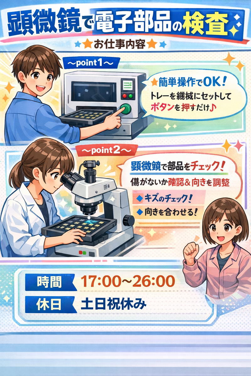 仕事内容 【お仕事内容】 ◎検査のお仕事をお願いします◎ ~point1~ 機械が苦手・自信がなくても大丈夫! 簡単操作でOK! トレーを機械にセットしてボタンを押すだけ! ~point2~ 自動機から出てきたトレーの穴にセットされた電子部品を 顕微鏡を使用し、傷がないかチェックします。 傷のチェックをしながら部品の向きを合わせる作業も行います。 *そのほか製品をシートに貼り付け作業があります - ★空調完備のお部屋でのお仕事です ★未経験者歓迎! 慣れるまでは先輩社員が丁寧に教えてくれますよ! ★作業服通勤OK! ◇ここもチェック!◇ 勤務先:上越市 休日: 土・日・祝(他会社カレンダー) 応募資格:なし 福利厚生: 社会保険完備/交通費規定支給(上限15,000円/月)/私服勤務/マイカー通勤OK/各種福利厚生充実/プライバシーマーク取得済/面接時マスク着用/リモート面接OK 応募方法:webまたは電話 [派遣会社連絡先] 〒943-0805 新潟県上越市木田2丁目1番1号上越セントラルビル7F-2 025-530-7272/0120-62-2011 備考: この求人以外に派遣・バイト・アルバイト・パートや 軽作業、製造、事務のお仕事に興味のある方、 短時間、短期・長期歓迎です。 上越市、妙高市、糸魚川市、柏崎市でお仕事をお探しの方、 未経験、ハローワークでお探しの方もお問い合わせください。 - お仕事相談会のお知らせ(予約不要・履歴書不要) 上越市近郊で仕事をお探しの方、必見です! 「今の職場を変えたい」「そろそろ働きたいけれど不安」そんなお悩みはありませんか? そんな方はぜひお仕事相談会に寄ってみてください◎ 【開催日時】 ①5月23日(土) 11:00〜14:30 ②5月30日(土) 12:00〜14:30 ※お好きな時間にお越しください。事前予約も不要です! 【会場】 上越市民プラザ 1F 多目的学習室 (上越市土橋2554) 【この相談会のポイント!】 ✅手ぶらでOK!:履歴書も証明写真も必要ありません。 ✅服装自由:お買い物ついでに、普段着で気軽にお立ち寄りいただけます。 ✅即相談・即登録が可能:良いお仕事があれば、その場ですぐにご紹介。 ✅来場特典あり:ご登録いただいた方には、QUOカード1,000円分をプレゼント! 【こんな方にオススメです】 「パートがいいかフルタイムがいいか迷っている」 「上越市内で、家から近い職場を探している」 「まずは話を聞いてみるだけ」でも大歓迎です。 私たちのスタッフが、あなたのこれまでの経験やこれからの希望を丁寧に伺います。 一人で悩む前に、まずは一度お話ししてみませんか?