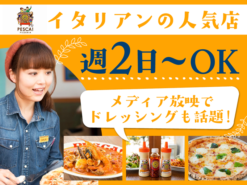 仕事内容 This position requires Japanese Language Proficiency Test Level N1 or higher. 学校終わりの学生も「友達同士で応募」OK! 《週2日~》平日のみ・土日祝のみも可能 《1日3h~》9:00~21:30の間で応相談 <30~50代の主婦やフリーター活躍中!> < 髪型&髪色自由!ピアスOK! > お料理が一番美味しい、「作り立ての提供」に こだわったサービスが人気の*イタリアン* --*-*-*-*-*-*-*-*-*-- < 仕事内容 > 【ホール】 *接客・レジ・料理提供・片付け 【キッチン】 *調味料の計量・食材の下準備 *料理の盛付け・洗い場でのお皿洗い <常に3名体制で安心スタート!> 先輩が近くにいるので、困ったことがあれば いつでも頼れる!安心してご応募ください! ※「9-11時」は仕込み・清掃がメイン! --*-*-*-*-*-*-*-*-*-- <スタッフにインタビュー>【主婦Aさん】 子育てが少し落ち着いたから、お小遣い稼ぎ に週3日だけ働いています!飲食店の勤務は 初めてで、お仕事自体も久しぶりでしたが、 先輩がイチから&丁寧に教えてくれたので、 すぐに仕事に慣れることができ安心でした! --*-*-*-*-*-*-*-*-*-- 《アピールポイント》 *店舗サービスとしてピザの食べ放題あり! (出来立てのピザを各テーブルに配ります!) *市内のピザコンテストにて、優勝経験あり *ピザの他、パスタ・ドレッシングも人気! [ドレッシングについて] メディアに取り上げられたこともあるほどの 大人気商品!通信販売でも売上好調です!