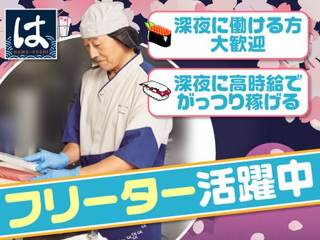職場環境 【従業員構成】 *はま寿司には色々な働き方をしているスタッフがいます。 ・夜の時間を有効活用してサクッと稼ぎたい学生さん ・がっつり稼ぎたいフリーターさん など 毎日のスキマ時間でも、ガッツリフルタイムでも働けるから、家事・育児・学校・趣味との両立がしやすいと好評です。 スキマバイトにもうってつけです! 【職場の雰囲気】 にぎやかな職場 協調性がある 立ち仕事 アットホーム お客様との対話は少ない 長く働ける 力仕事が少ない 自分の都合に合わせやすい 知識、経験不要