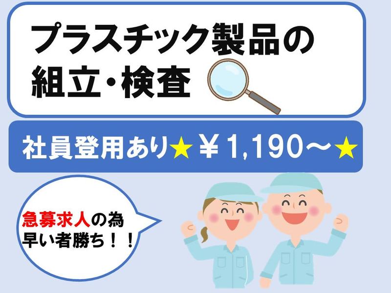 仕事内容 \高時給×未経験歓迎!モクモク作業/ 「ネイル・髪色自由な会社で働きたい」 「とにかく稼げる仕事がしたい」 「人と関わるより、1人作業の方が向いている」 そんな方にピッタリの職場です! ー 【お仕事内容】 自動車に使用するプラスチック製品の組立、検査、シール貼りをお願いいたします。 作業内容はシンプルで、未経験の方でも安心してスタート可能です! <作業の流れ(例)> ① 電ドラなどで組付け ② 簡単な目視検査 ③ シール貼り ★作業はマニュアル通り! ★難しい加工や専門技術は不要です ★空調完備で快適な作業環境! ★手のひらサイズで重量物は一切ありません ー 【未経験スタート9割以上】 「工の名前すら知らなかった」 そんな方も活躍している職場です◎ ✅ 教育担当の先輩がマンツーマンで指導 ✅ 覚えるまでは簡単な作業からスタート ✅ 作業は分業制なので「いきなり任される」ことはナシ! ー 【働きやすさポイント】 ✔ 日勤のみ!生活リズムが安定 ✔ 土日休み+大型連休あり(GW・夏季・年末年始) ✔ モクモク作業中心!人間関係のストレス少なめ ✔ ネイル・髪色自由 ー 【こんな方におすすめ】 ・未経験からものづくりの仕事に挑戦したい方 ・シンプルな工場作業で安定収入を得たい方 ・プライベートも大切にしたい日勤派の方 ・地元で長く働きたい方 ・とにかく稼ぎたい&即日スタートしたい方