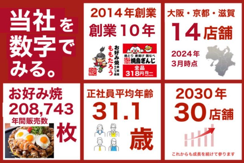 仕事内容 現在飲食店勤務して「給与をあげたい、 休みや手当が充実した会社で働きたい 今後のキャリアに不安」と 少しでも不安を持っているあなた! 是非読み進めてください 当社は2014年創業、業績は好調を維持! 現在16店舗展開しており 2030年には約2倍の30店舗を目指した増員募集! 研修終了後のスタート月給は35万円以上 の高月給をお約束!安定して稼げます! 入社3年で年収500万円の実績あり! また、大手にはないスピード感で 昇給や昇進などキャリアアップが実現出来ます★ また手当多く福利厚生も充実! (家族・調理師・住宅・成果) 土日祝の休みも取得可能! 子どもの行事参加休暇なども 働く人を大切にしています! その結果、直近1年間の離職率2.5%! 従業員の定着率も抜群です! ノルマや降格もなく社内会議もないので 店舗業務に集中出来る経営体制を整えています 【お仕事内容】 ホール・キッチンなど 店舗業務(運営業務)をお任せします! 初めは以下業務をお任せします! ・お客様のご案内 ・オーダー取り ・仕込みや調理 ・料理のご提供(配膳) ・清掃、後片付け など ゆくゆくは「店長候補」として ・新商品の開発 ・シフト作成 ・アルバイト採用、育成 ・売上管理 などを任せていきます。 ※店舗展開によっては同都道府県内での転勤可能性有 ≫≫≫当社について≪≪≪ 創業10年、外食事業の直営による経営を展開中! <お好み焼部門>お好み焼ももたろう <焼鳥部門>焼鳥ぎんじ <手羽先部門>手羽助 ★2030年までに30店舗&海外展開計画中★  ̄ ̄ ̄ ̄ ̄ ̄ ̄ ̄ ̄ ̄ ̄ ̄ ̄ ̄ ̄ ̄ ̄ ̄ ̄ ̄ 飲食業で成長し続け、2024年現在も積極的な出店を続けています。 8期の業績は、売上前年比134%、客数前年比142%と業績も好調!! 今後も新店を大阪・京都・滋賀など関西圏で出店していく計画です。 また2030年には東京、そして海外出店も視野に入れています。 ✅プライベートと両立して働ける♪  ̄ ̄ ̄ ̄ ̄ ̄ ̄ ̄ ̄ ̄ ̄ ̄ ̄ ̄ ̄ ̄ ̄ ・1日最短5時間の勤務あり ・土日祝日の休みも取得可能 ・年末年始はお休み ・子ども行事参加休暇 などなど働きやすい環境づくりのために 様々なことに取り組んでいます! ✅「なし経営」を推進中!  ̄ ̄ ̄ ̄ ̄ ̄ ̄ ̄ ̄ ̄ ̄ ̄ ̄ ・ノルマなし ・降格なし ・社内会議なし 責任のある仕事をお任せする代わりに スピード感のある体制を整えております。