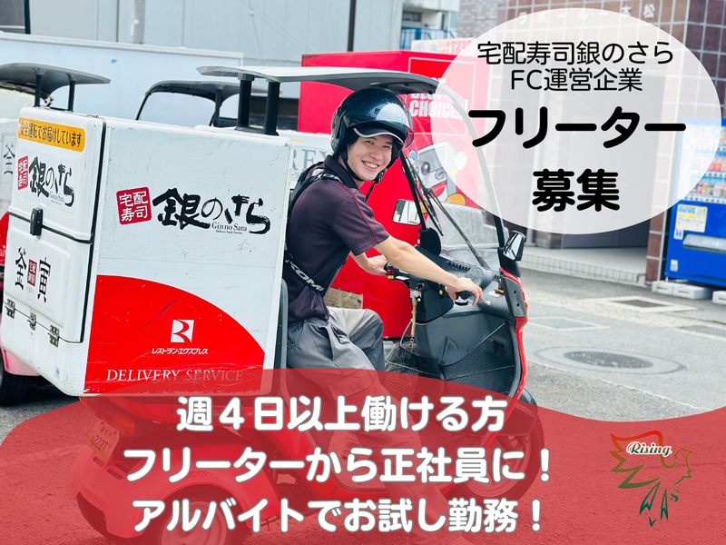 求めている人材 ◆必須◆ ✅要原付免許(普通自動車免許可) ◆採用基準◆ ✅挨拶ができる ✅「ありがとう」が言える ✅「ごめんなさい」が言える ✅嘘をつかない ◆働く社員さんのデータ◆ ・平均勤続年数8.1年 ・定着率95% ・20代、30代スタッフが73% ◆長く続けられる秘訣は、、、?◆ 働く社員さんのアンケートで会社の 良いところとして「人間関係の良さ」 と答える社員多数♪ ★社員さんのアンケートを一部紹介★ Q.ライジングを選んだ理由は? ・アルバイトで働いていて丁寧に 教えてもらい人の温かみを感じたため ・上司の面倒見がいいため ・働いている人の人柄が良い ・家から近かったため ・社員同士の仲が良かったため ★アルバイトで人間関係や 職場の雰囲気が好きで 正社員になっていただく方が9割以上♪ Q.人間関係が良いと思うエピソード ・卒業後、10年以上たっても いまだに呑みに行っていること ・配達をし始めた時に 色々な道を丁寧に教えて頂きました ・社員やアルバイトさんの誕生日などを しっかりとお祝いするところ ・上司が自分を社員としてではなく、 一人の人間として見てくれます。 ・関わりの少ない店舗からも 気にかけてくれる ・イベントで自分含め皆楽しんでいる所。 仕事外での交流もあり、 グループ全体としての関係もある所 ・困った時に上司や仲間が相談に乗ってくれ 親身に聞いてくれるところ ・プライベートでも ご飯や飲み会などがあるところ! ・アルバイトさんと協力して仕事をする事 ・上司の人が人に対して 責任を持っていると思う。 ・過去に私が担当したお店の子たちから、 いまでもちらほらと連絡をくれます。 ◆こんな方が活躍しています◆ アルバイトからの社員になった方や 前職は居酒屋、新聞配達、営業、 鳶、パン工場など様々な経歴の方がいます。 また、アルバイトで経験したお仕事も ハンバーガー屋、居酒屋、ラーメン屋、 コンビニ、唐揚げ屋、倉庫、工場、 携帯ショップ、スーパー など様々♪