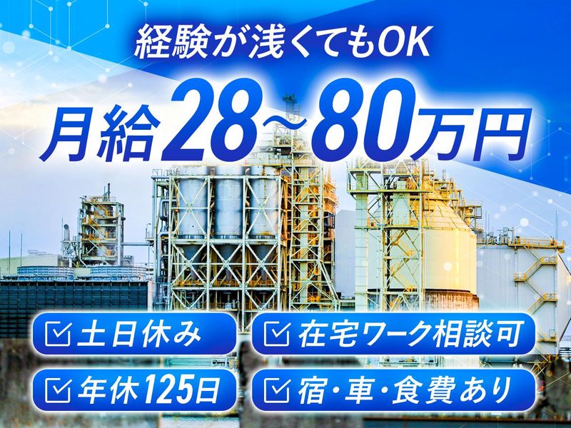 仕事内容 <経験がものを言う年齢だからこそ> 施工管理として積み上げてきた実績、 次は“働きやすさ”と“待遇”で報われる環境へ。 ◆ 月給28万円~80万円 ・【昇給実績あり】半年ごとの評価制度で、努力がカタチに ・経験・資格に応じて月給35万円以上のスタートも可能 ◆ 在宅ワーク相談OK ・書類作成や工程表など、一部業務は在宅で対応可能 ・現場との連携もオンラインで進められる体制あり ◆ 完全週休2日制(土日)+祝日 ・現場に追われ続けない働き方へ ・有給休暇取得率も80%以上で、無理なく続けられる環境 ◆ 手当・待遇も納得 ・【食事手当】1日1,000円(※現場による) ・【住宅手当】基本的に全額支給(※現場による) ◆ 柔軟な働き方にも対応 ・在宅・車通勤OK/無料駐車場あり ・転勤の有無も選択可能 ・U・Iターン歓迎/社宅制度あり ◎例えばこんな方に 「若手と同じ働き方には、もう無理があると感じ始めた」 「技術と経験を活かしながら、家族との時間も大切にしたい」 ――そんな思いを実現できる環境です。 ==================== 各種プラントに関する設計・施工管理をお任せします。 【具体的な業務内容】 ・石油化学工場、発電所、環境施設(ごみ焼却場・上下水施設など)の建設・改造・メンテナンス ・配管・圧力容器(塔・槽・熱交換器)の設計・施工管理 ・回転機(ポンプ、ファン、コンプレッサー)の設計・施工管理 ・電気計装設備の設計・施工管理 ・建設プロジェクトのマネージャーまたは補佐 ・プロセスエンジニア業務 「現役時代と同じ仕事がしたい」 「家族との時間を大切にしたい」 「ライフステージに合わせて働き方を変えたい」 そんな想いに応える職場です。 あなたの希望、ぜひ面接でお聞かせください◎ ====================