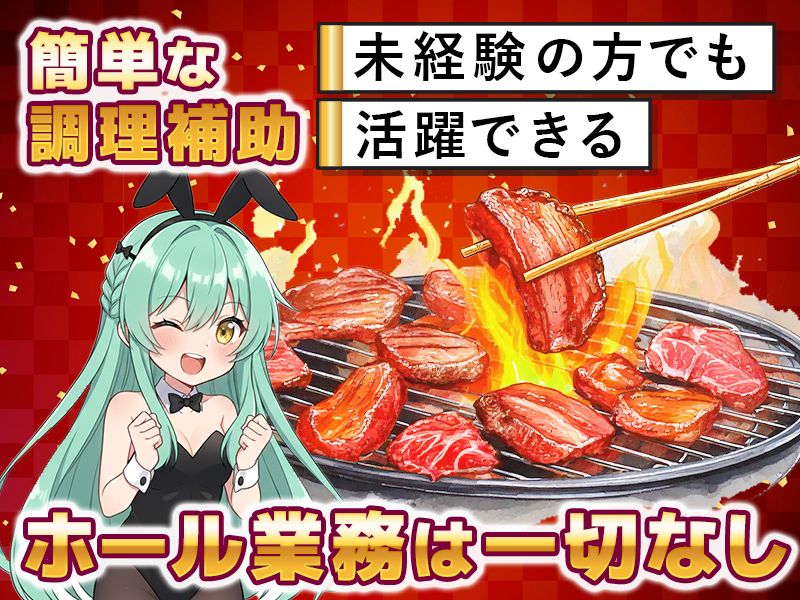 仕事内容: SNSでも話題! 大阪・難波にある「焼肉とバニーガール」で キッチン業務(調理補助)を大募集中! 華やかなバニーガールたちが活躍するお店を、 裏から支える「完全裏方」のお仕事です。 【具体的な業務内容】 ●簡単な調理補助(盛り付けや仕込みなど) ●ドリンク作り ●食器洗い(洗い場メインも可) ●キッチン内の清掃 【ここがポイント】 ●接客業務は一切ありません キッチン内でコツコツと作業に 集中していただけます。 「接客は苦手だけど、料理は好き」 「賑やかな店内で、裏方として働きたい」 という方にピッタリです。 ●未経験でも安心のサポート 難しい調理技術は必要ありません。 まずは簡単な盛り付けや洗い場からスタート。 未経験の方も丁寧にサポートしますので ご安心ください!
