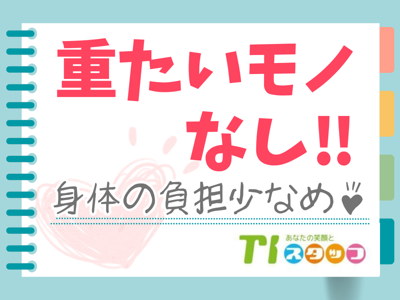 仕事内容 ◎ シール貼り・梱包 ◎ 軽量品ライトの包装、 ウエスでの拭き取りなどをお任せします! 分担しての軽作業のお仕事なので安心♪ 難しいこと・重たいモノはありません。 シンプル作業で負担もなく すぐにマスターできます! 慣れるまでは「シール貼り」「梱包」 「材料を近くに持ってくる」 「完成品の拭き取り」などの 簡単な作業から始めます! 経験者や慣れてきた方は 電ドラでの組立て作業をお願いします! ・空調完備☆ ・お子様の発熱などの急なお休みにも対応! ・コーヒー、お茶、水飲み放題♪ ・20~40代半ばの男女活躍中!