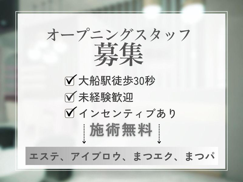 仕事内容 ⭐オープニングスタッフ募集⭐ ⭐みんな一緒のスタートなので安心⭐ ⭐未経験の方・経験者の方大歓迎⭐ ⭐ノルマなし!押し売りなし!⭐ ⭐髪型・髪色自由であなたらしく働ける⭐ ⭐集客はインスタを中心に行っています⭐ (今後はWeb広告も行っていく予定) ☆ お仕事内容 ☆ ✅カウンセリング ✅まつげエクステ施術 ✅まつげパーマ施術 ✅アイブロウスタイリング施術 ✅サロン内の衛生管理 ✅施術準備 ✅電話対応・事務作業 ✅会計など ✨まずはカンタンなお仕事から 慣れていきましょう。 わからないことがあれば、 スグに近くの先輩に質問できます◎ なんでも相談してくださいね! やる気がある方は、積極的に 採用しますので、お気軽に ご応募ください。 ――――――――――――――――*。・ \ スリーズララ 大船店✨ / 1日の予約人数は4~7名を想定しており、 アイリスト3名、エステティシャン2名の スタッフ5名体制で施術を行っていきます。 【コンセプトについて】 「美容が好き。でも、それ以上に人が好き。」 私たちが目指すのは、ただキレイを届けるだけでなく、 お客様の心に寄り添えるサロンです。 まるで昔からの友達の家のように、ふらっと立ち寄れて、 会話を楽しみ、癒されて、笑顔で帰れる 流れ作業ではなく、ひとり一人と丁寧に向き合い、 スタッフの人柄でファンができるサロンを目指しています。 忙しいOLさんや子育て中のママたちにも “ちょうどいい癒しとキレイ”を提供できるよう、 空間・メニュー・時間すべてにこだわっています。 ⏩「大船駅」より徒歩30秒 ⏩藤沢駅、辻堂駅、戸塚駅、 本郷台駅、鎌倉駅、港南台駅、 由比ヶ浜駅方面からもアクセス便利です◎ ・。*――――――――――――――――