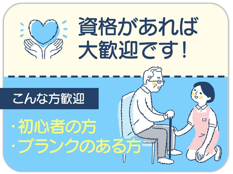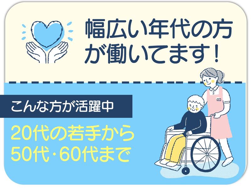 求めている人材 <必須資格> 介護職員初任者研修 (旧ヘルパー2級) <活躍中> ●20代・30代の若手メンバー ●扶養内で家庭と両立の主婦さん ●40代・50代の中高年の方 ●60代~定年後のシニアの方 <こんな方歓迎> ◆ブランクのある方 ◆資格を活かして働きたい ◆長期で安定して働きたい方 ◆パート、アルバイトから正社員を目指したい方 ◆介護スタッフのご経験がある方は尚歓迎!