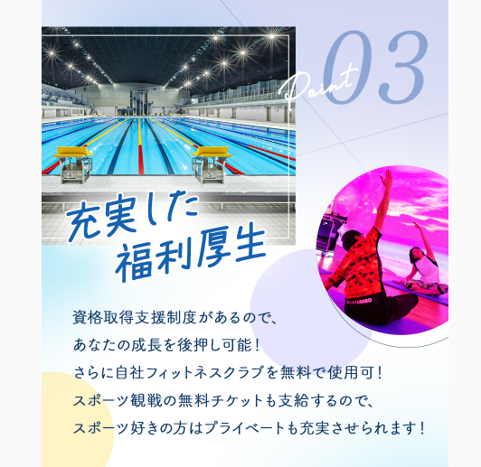 求めている人材 ✅フィットネスインストラクター 経験をお持ちの方 ✅簡単なPC操作が可能な方 ⏩スポーツ専門学校を卒業した方、 体育大学を卒業した方、 水泳部出身の方も大歓迎! ⏩スポーツ系の学部・学科で 学ばれた方は特に歓迎いたします <こんな方歓迎!> ■スポーツ・運動・フィットネスが好き ■企画やアイデアを考えるのが好き ■SNSを見る・投稿するのが好き ■人を楽しませることが好き ■企画運営経験を活かしたい・ チャレンジしてみたい <こんな方にぴったり!> ■新しいことに挑戦するのが好き ■企画・改善など主体的に取り組みたい ■人の成長をサポートすることに やりがいを感じる ■指導経験を活かして キャリアアップ・幅を広げたい ༶ ༶ ༶ ༶ ༶ ༶ ༶ ༶ ༶ ༶ ༶ ༶ ༶ ༶ ༶ ༶ ༶ ༶ ●ブランクOK ●経験者歓迎/経験者・有資格者歓迎 ●既卒歓迎/第二新卒歓迎 ●未経験者歓迎/未経験・初心者OK ●主婦・主夫歓迎 ༶ ༶ ༶ ༶ ༶ ༶ ༶ ༶ ༶ ༶ ༶ ༶ ༶ ༶ ༶ ༶ ༶ ༶ 今回募集するお仕事では、 スポーツトレーナー、 フィットネスインストラクター、 スイミングインストラクター、 施設運営、イベント企画、イベント運営、 接客、販売、警備スタッフ、 サービス提供、マネジメント などの経験が活かせます!