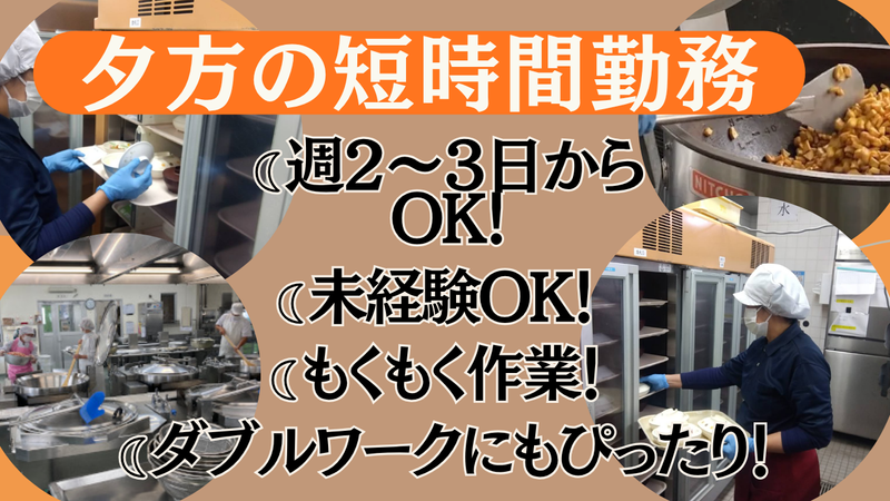 仕事内容: 夕方から短時間で働きたい方にぴったりです。 ダブルワークにも合わせやすい、介護施設の給食スタッフ募集です。 お任せするのは、介護施設での給食準備。 食器洗浄、朝食の盛り付け、検品、配膳、清掃、下膳、洗浄などをお願いします。 特別な経験はいりません。 最初は覚えやすい作業から少しずつ始められます。 「給食の仕事は初めて」 「厨房の仕事は久しぶり」 そんな方も大丈夫です。 _____ 夕方から4時間。無理なく続けやすい仕事です。 勤務時間は 16:00〜20:00。 さらに、 18:00〜勤務スタートもOK です。 「昼の予定を終えてから働きたい」 「本業のあとに少しだけ働きたい」 「短時間で収入をプラスしたい」 そんな方に合う働き方です。 _____ この仕事のいいところ。 ・短時間だから続けやすい 16:00〜20:00の4時間勤務です。 長時間ではないので、体力的にも無理なく続けやすいのがポイントです。 18:00からの勤務も相談できるので、 予定に合わせて働きやすい環境です。 ・ダブルワークしやすい 夕方からの勤務なので、本業や日中の予定と両立しやすいシフトです。 「もう少し収入を増やしたい」 「空いている時間を活かしたい」 そんな方にもぴったりです。 ・未経験でも始めやすい いきなり難しいことはお願いしません。 まずは覚えやすい作業から少しずつ慣れていけます。 給食や厨房の仕事が初めての方でも、始めやすいお仕事です。 ・もくもく作業しやすい 少人数の職場なので、落ち着いて作業しやすい環境です。 必要なときはしっかり声をかけ合いながら、基本は自分の作業に集中できます。 接客より、もくもく作業が好きな方にも向いています。 ・食事を通して役に立てる仕事です 介護施設の食事は、利用者様の毎日に欠かせないものです。 ただ作業をするだけではなく、気持ちよく食事を届ける大切な役割があります。 「おいしい」と言っていただけることもあり、 やりがいを感じられる仕事です。 _____ 夕方シフトの1日の流れ 16:00 食器洗浄 食器洗浄を行いながら、朝食の盛り付け準備を進めます。 朝食の盛り付け・検品 翌朝に向けた準備を進め、内容に間違いがないか確認します。 17:45 配膳 食事を届けます。 その後、厨房内の清掃も行います。 18:45 下膳 食事後の片付けを進めます。 食器洗浄 20:00 終了 流れがある程度決まっているので、 一度覚えると動きやすい仕事です。 決まった流れの中で、丁寧に進められる方に向いています。 _______________________