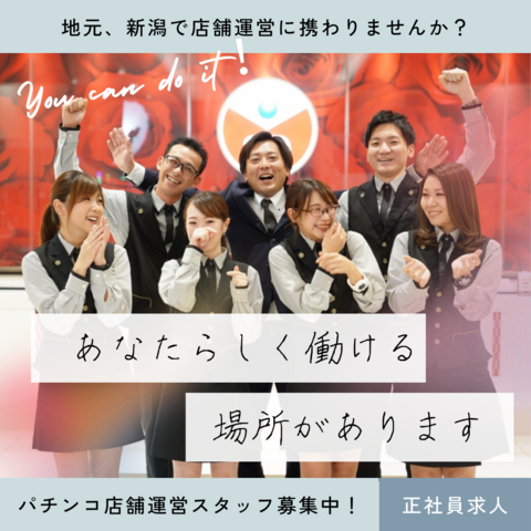 仕事内容 こんな方を探しています ━━━━━━━━━━━━━━━━━━━━━ ◇未経験だけど正社員として安定して働きたい ◇残業少なめでプライベートも大切にしたい ◇地元新潟で長く腰を据えて働きたい ◇接客やマネジメントスキルを身につけたい →ひとつでも当てはまる方、ぜひご応募ください! ━━━━━━━━━━━━━━━━━━━━━ ここがポイント! ━━━━━━━━━━━━━━━━━━━━━ 【1】月給24.5万円〜×地域トップクラスの好待遇 未経験スタートでも月給24.5万円以上を保証。 賞与年2回・昇給年2回で着実に収入アップが可能です。 【2】明確なキャリアパスで着実に昇格 社員 → 班長 → 副主任 → 主任 → 副店長 → 店長 年1回の昇格チャンスあり。実力次第で数年後に店長も! <給与例>4年目主任:年収450万円〜 【3】残業ほぼなし×実働7.5時間でプライベート充実 早番8:00〜16:30、遅番15:30〜24:00のシフト制。 夕方から自由時間を確保できる働き方が人気です。 【4】未経験歓迎×充実の研修制度 パチンコ業界未経験でも安心スタート。 現在活躍中のスタッフの8割が未経験からスタートしています。 【5】福利厚生完備×各種手当充実 通勤手当全額支給・家族手当・住宅手当・ 車の任意保険会社負担など待遇面も安心。 【6】有給取得しやすい×産休育休取得実績多数 有給消化率が高く、産休・育休の取得実績も豊富。 ライフイベントに対応できる職場環境です。 【7】20代若手が多数活躍×風通しの良い職場 10代・20代中心の活気ある職場。 意見を言いやすい環境で、長く働けます。 ━━━━━━━━━━━━━━━━━━━━━ 仕事内容 ━━━━━━━━━━━━━━━━━━━━━ 【最初の1〜3ヶ月】 まずは基本から! ・お客様のご案内 ・ホール巡回(台の状況確認) ・簡単な接客対応 ・開店・閉店準備 【慣れてきたら(3ヶ月〜)】 少しずつステップアップ ・カウンター業務(景品交換など) ・アルバイトスタッフへの業務指示 ・シフト調整のサポート 【将来的には】 店舗運営の中核として ・売上管理 ・スタッフマネジメント ・店舗改善の企画提案 ※ 個人のペースに合わせて進めるので、 焦らず着実にスキルアップできます!