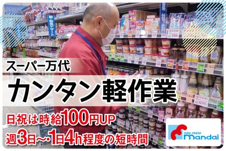 仕事内容 【 アピールポイント 】 ・扶養控除内や短時間勤務、Wワークも相談可 (お昼過ぎまで!1日4h程度でOK) ・家庭と両立しながら働く主婦(主夫)の方多数在籍中 ・お子様の急な発熱も全員でサポートします ・希望休も最大限考慮!ご家族の予定やお子様の学校行事等もご相談ください 【 仕事内容 】 <万代の新規サービス★ネット宅配事業> ・注文リストに沿って、検品&梱包作業 ・宅配で使用する箱やカゴの拭き清掃 ・什器/備品の整理整頓 その他、ネット宅配会員募集やチラシの投函など 「商品の個数」「汚れ・キズ」 などをチェックしながら 新鮮で美味しい食材や日用品を 丹精込めて詰めていってくださいね♪ 【 仕事の流れ 】 <1日の流れ(例)をご紹介> ▼出勤 ・注文リストの確認 ・商品のピックアップ ・検品&梱包 ・お客様ごとに商品のセッティング ▼業務が落ち着いたら… 近隣エリアにチラシをポスティング ※店内・片道徒歩10分程度のエリア ※ノルマなどはなし ▼お仕事終了 【 未経験でも安心! 】 <丁寧な研修&フォロー体制が自慢!> 宅配サービス開始に伴い、軽作業スタッフ大募集! 「色んな事情で買い物へ行けない」 そんなお客様の元へ商品をお届けする大切なお仕事! 「モクモク・コツコツ作業が好き」 「スキマ時間を有効活用したい」 「近所で働きたい」etc… 志望動機は何でもOK!社員がしっかりサポートします◎ 【 ママさんスタッフ多数在籍! 】 *1日4h程度の短時間 *お子様の急な発熱も全員でサポート◎ …など、働きやすさが詰まった職場! そのためか、他店舗では主婦さんが多数活躍しています。 また、スタッフ同士で助け合う風土。 安心して働けると人気なんです♪