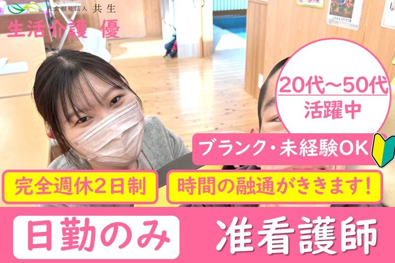 【応募資格】 ●准看護師 ※正看護師の方もご応募ご相談大歓迎です。 ●皆さん大歓迎です ・現場経験からブランクがある方 ・介護施設や障害福祉施設での経験がない方 ●普通自動車運転免許(AT限定可) 【メリット】 #ブランクOK #40代も応募可 #50代も応募可 #車通勤OK #交通費支給 #残業なし #経験者歓迎 #社会保険完備 #昇給あり #賞与あり #主婦・主夫歓迎 #新卒歓迎 #第二新卒歓迎 #未経験者歓迎 #有資格者歓迎 #学歴不問 #資格取得支援あり #育休制度あり #育児サポートあり #60代も応募可 #バイク通勤OK #転勤なし #制服貸与