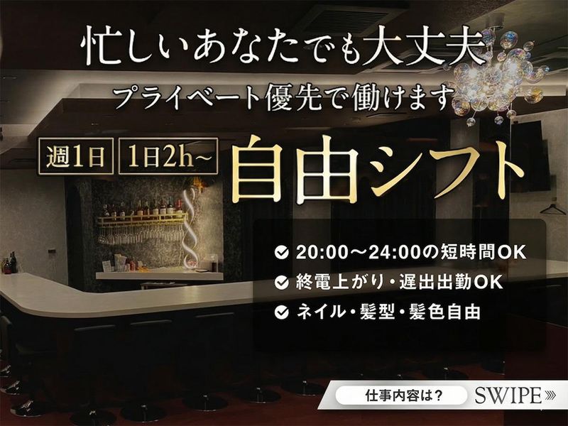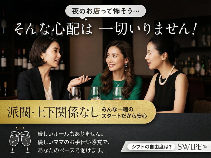 求めている人材 経験やスキルは一切問いません。 お客様と楽しく会話ができる、明るく前向きな方を歓迎しています。 ・自由シフトで無理なく働きたい方 ・落ち着いた雰囲気のお店で安心して働きたい方 ・初めてのナイトワークに挑戦したい方 ・接客や人と話すことが好きな方 ・副業・Wワークと両立できる職場を探している方 ・ブランクがあっても新しい環境で再スタートしたい方 ・稼ぎたい目標がある方 接客・ナイトワーク未経験の方、学生・会社員・主婦・フリーターなど、どなたでも安心して働ける環境です。 まずはお気軽にお問い合わせください。