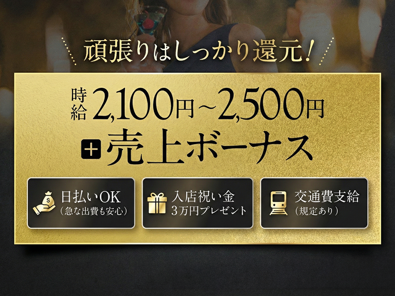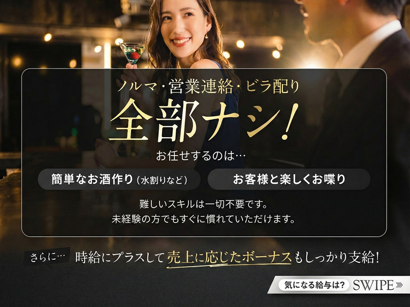 仕事内容 <ラウンジスタッフ募集> お任せするのは、簡単なお酒作りとお客様との気軽なお喋りです。 特別なスキルや経験は必要なく、未経験の方でも始めやすいシンプルなお仕事です。 ノルマ・営業連絡・ビラ配りなどの負担は一切ありません。 落ち着いたお客様が多く、無理なく自然体で働ける環境が整っています。 さらに、時給2,100円〜2,500円に加えて各種バックがあるため、短時間でもしっかり稼ぎやすいのが魅力です。 日払いOK、交通費支給、入店祝い金3万円(規定あり)など待遇も充実しており、効率よく収入を得たい方にもぴったりです。 シフトは完全自由で、学校・昼職・家事との両立も可能。 学生さんやWワークの方、主婦の方など、ライフスタイルに合わせて無理なく働けます。