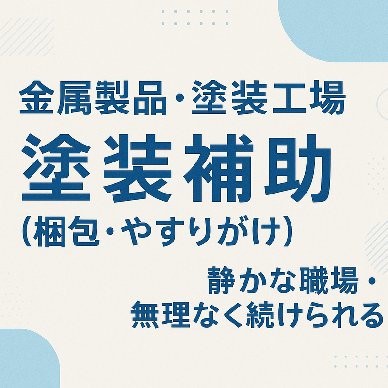 仕事内容 ガヤガヤせず、せかされない。 静けさの中で、ゆっくり覚えられる工場です。 40〜60代の方も実際に活躍しており、落ち着いた環境で長く働けます。 お任せするのは、金属製品の「塗装補助」の作業。 最初に覚えるのは、梱包ややすりがけなど、本当にシンプルな軽作業です。 危険作業はなく、重いものを扱う場面もあまりありません。 朝は代表や先輩が「今日はここからやろう」と順番を示し、 迷わず取りかかれるように流れが整っています。 少人数のため、いつも同じ人がそばにいて、自然と聞きやすい距離感です。 ▼ 主な作業内容 ・前日仕上がった製品の梱包 ・塗装前の金属部品のやすりがけ ・設備部品などの焼付塗装の補助 ・簡単な運搬(重量物なし) どれも、手順が決まっていて落ち着いて取り組める作業ばかり。 作業中は、同じペースで静かに進むため、気負わずに集中できます。 無理にスピードを求められることもありません。 入社後は梱包からスタートし、慣れてきたらやすりがけ、 その後に塗装補助へと“段階的に”進んでいきます。 覚えることが多くないため、未経験でも1つずつ身につけられる環境です。 休憩もしっかり取れます。 昼の60分に加えて、毎日15時に30分の休憩があり、 「お疲れさま」と声が飛び交う、落ち着いた時間が流れます。 体に負担をかけずに働けるよう、会社として休憩を大事にしています。 塗装工場と聞くと、ニオイや煙を気にされる方もいますが、 換気設備を整えており、空気がこもらないよう管理しています。 安全面も丁寧に配慮されているため、安心して作業に向き合えます。 少人数の静かな職場で、淡々と作業を積み重ねながら、 自分のペースを保って働ける環境を用意しています。 「最後の転職を落ち着いた場所でしたい」という方に、 無理なく続けられる仕事です。