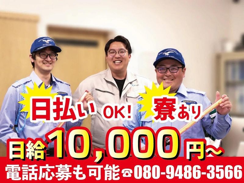 仕事内容 <<中高年・シニアさん活躍中!>> *60歳以上の方、定年退職後~はじめた方も 多数活躍しています! *無理のない範囲で、週3日~勤務OK! *続けられるか不安…という方は、 最短3日~の【お試し短期】も歓迎します。 ■■電話応募も可能!■■ 080-9486-3566 採用担当まで ☆面接から即日勤務可能!履歴書不要! ☆WEB面接も対応してます! ■■■■■■■■■■■■ 【仕事内容】 商業施設やオフィス、公共施設などの 駐車場での安全を守る警備のお仕事です。 ・車両の誘導 └ 道路から駐車場へ入る車の誘導や、空きスペースへのご案内 ・歩行者の安全確保 └お子様や高齢者の方が安全に歩けるようサポート ・お困りごとの対応 └「入口はどこ?」といった簡単な施設のご案内 などをお願いします。 ☆シッカリ稼ぎたい、という方には、 駐車場以外の警備現場で勤務いただくことも可能です◎ ☆難しい作業などはありません! 警備のお仕事が未経験の方もご安心ください。 ◇◇◇弊社の推しポイント◇◇◇ ★日払いOK!週払いOK(規定あり) ★早上がりでも日給保証あり ★面接から即日勤務も可能! ★プライベートで使用できる社用車支給 ★直行・直帰推進 ★即日入居可能! 初期費用なしの1DK寮あり! (エアコン・家具・家電付き、 駐車場代無料やバス・トイレ別の寮もあり) ※毎月の家賃:4万2000円~ ★髪型・髪色自由♪ひげ・ネイル・ピアス◎